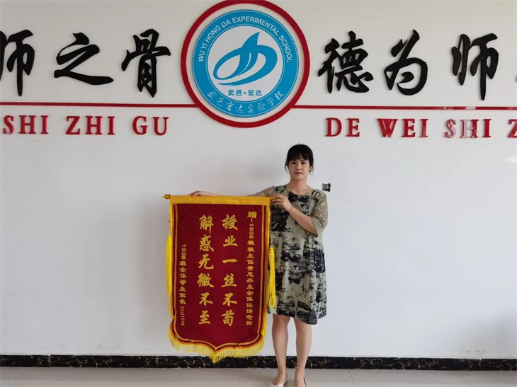近日,宏达实验学校初二年级1936班班主任黄思奇收到一份了特殊的“礼物”,1936班全体学生家长将一面绣有“授业一丝不苟 解惑无微不至”的锦旗送到了学校,以此表达对班主任黄思奇和全体任课老师的感谢,以及对学校规范化管理的肯定。