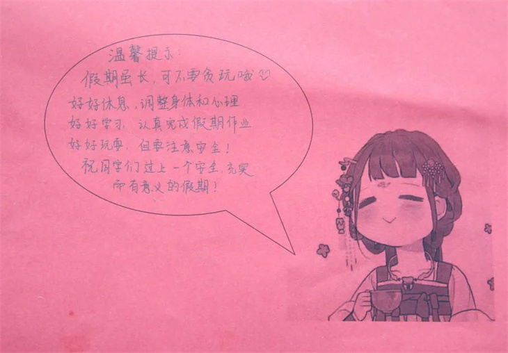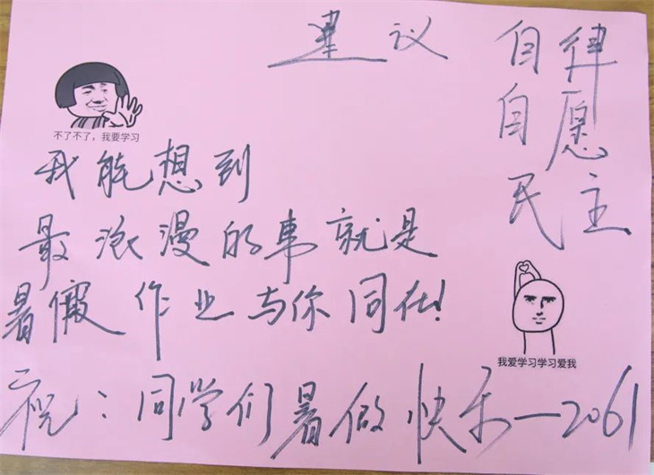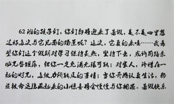我希望你们这个假期对学习保持炙热,坚持下去,或许前路未必光明坦荡,但你一定充满无限可能;对家人,珍惜在一起的时光,多做力所能及的事情;当你开始认真生活,那些被命运隐藏起来的小惊喜将会慢慢与你相遇。