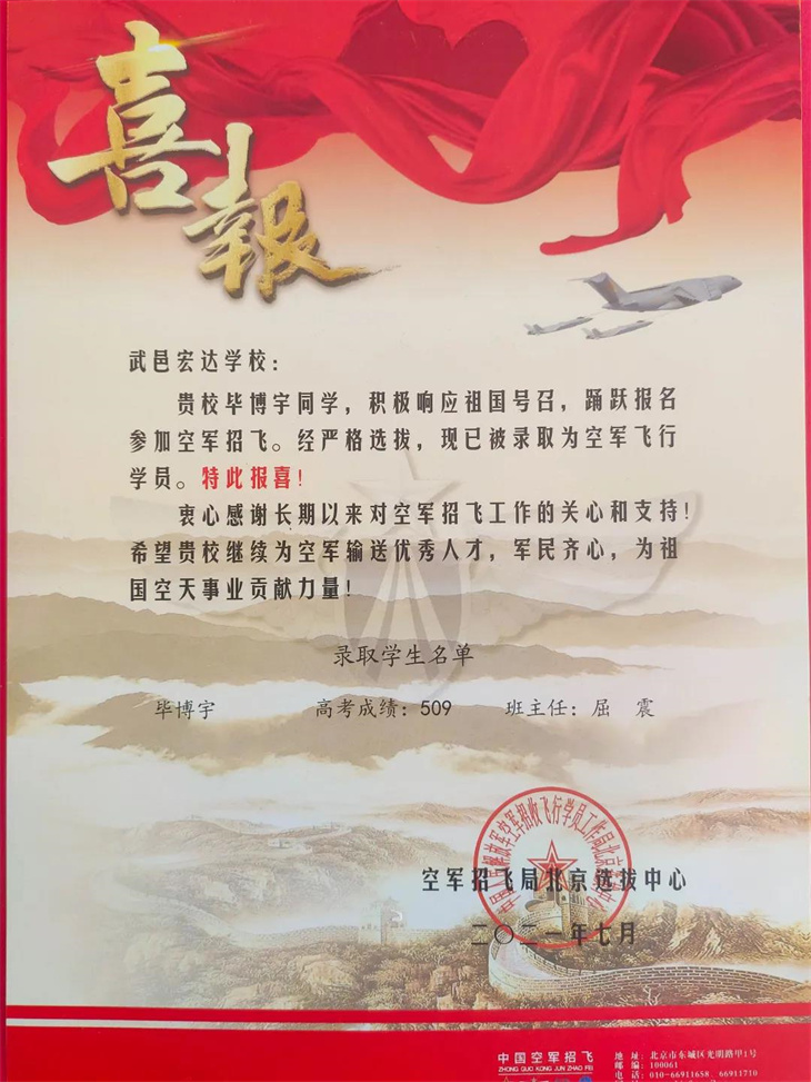 一直以来,我校积极响应为党育人,为国育才,始终践行立德树人根本任务,通过开展丰富多彩、形式多样的爱国主义教育,培养学生家国情怀,引领学生树立报效祖国的理想追求。我校多年来为空军输送了多名优秀飞行学员,2021年又新添一名毕业生毕博宇同学,光荣地被录取为空军飞行学员。