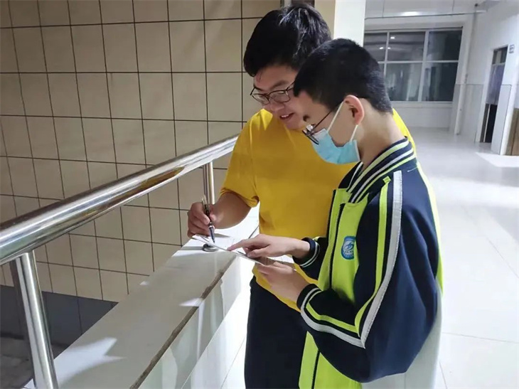 20:30,晚自习间隙,班主任们来到教室辅导学生们学习,与任课老师沟通学生近期表现情况。