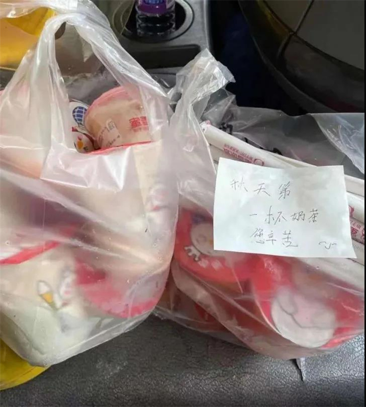 消防人员联系当地公安局看了监控视频发现,是一名白衣男孩经过看到消防车后,急忙赶到附近的奶茶店买了15杯奶茶,放入消防车内便匆匆离开,同时留下一张字条“秋天第一杯奶茶,您辛苦“。当天天气很热,白衣男孩都没有给自己买一杯,买来的奶茶全部送给了指战员们。