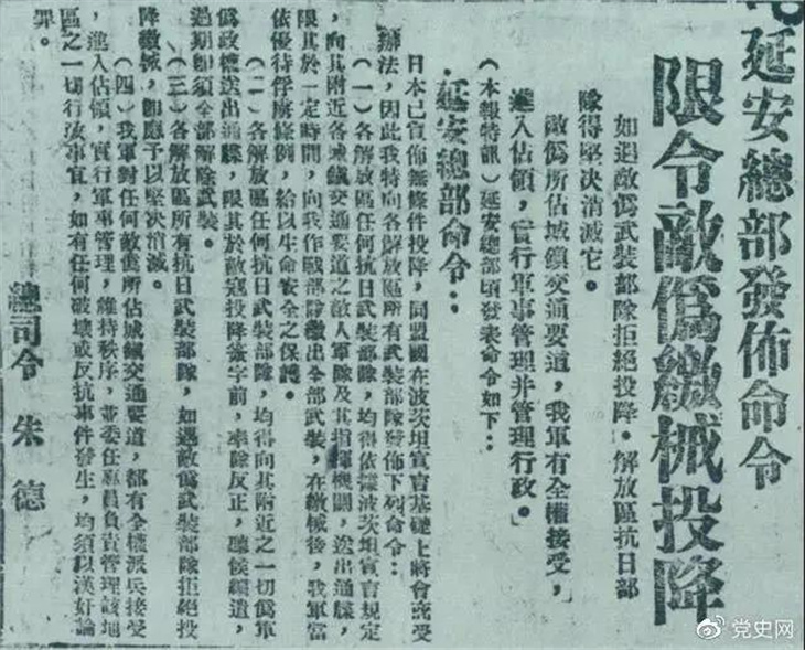 1945年8月10日,朱德发布命令,限令日伪军缴械投降。图为当时的报道。