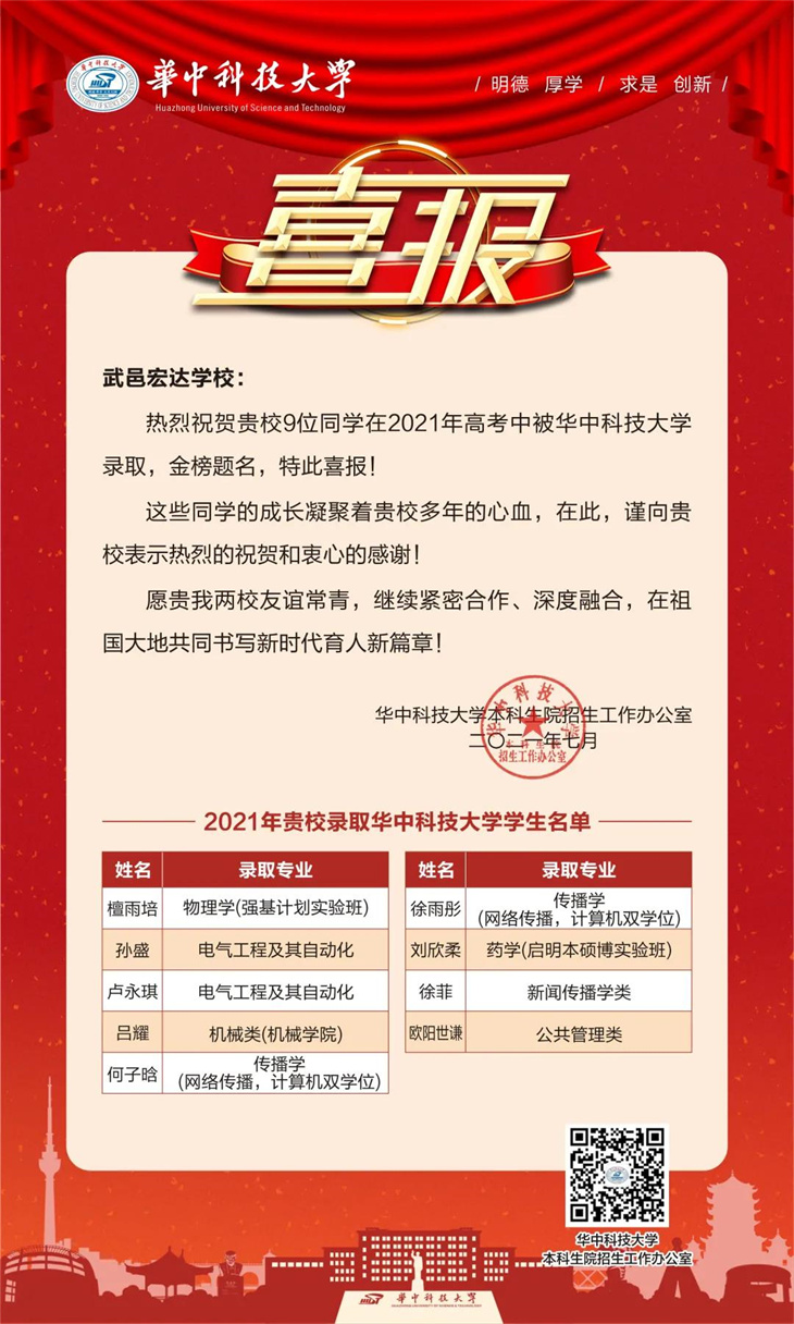 多年来,我校为华中科技大学输送了大批品学兼优、德才兼备的优秀学子,他们在华中科技大学脚踏实地、仰望星空,取得了一系列优异成绩。华中科技大学特向我校发来喜报表示热烈祝贺,向我校辛勤付出的老师致以崇高敬意,向努力拼搏的莘莘学子致以良好祝愿,希望两校继续努力,携手同行,坚持立德树人根本任务,共同为国家培养更多优秀人才!