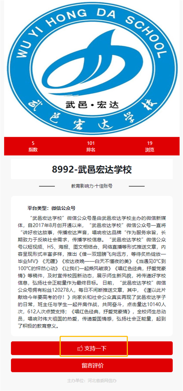 投票啦┃8992号“武邑宏达学校公众号”正在参加河北省2021年新媒体影响力评价和扶持工作满意度测评