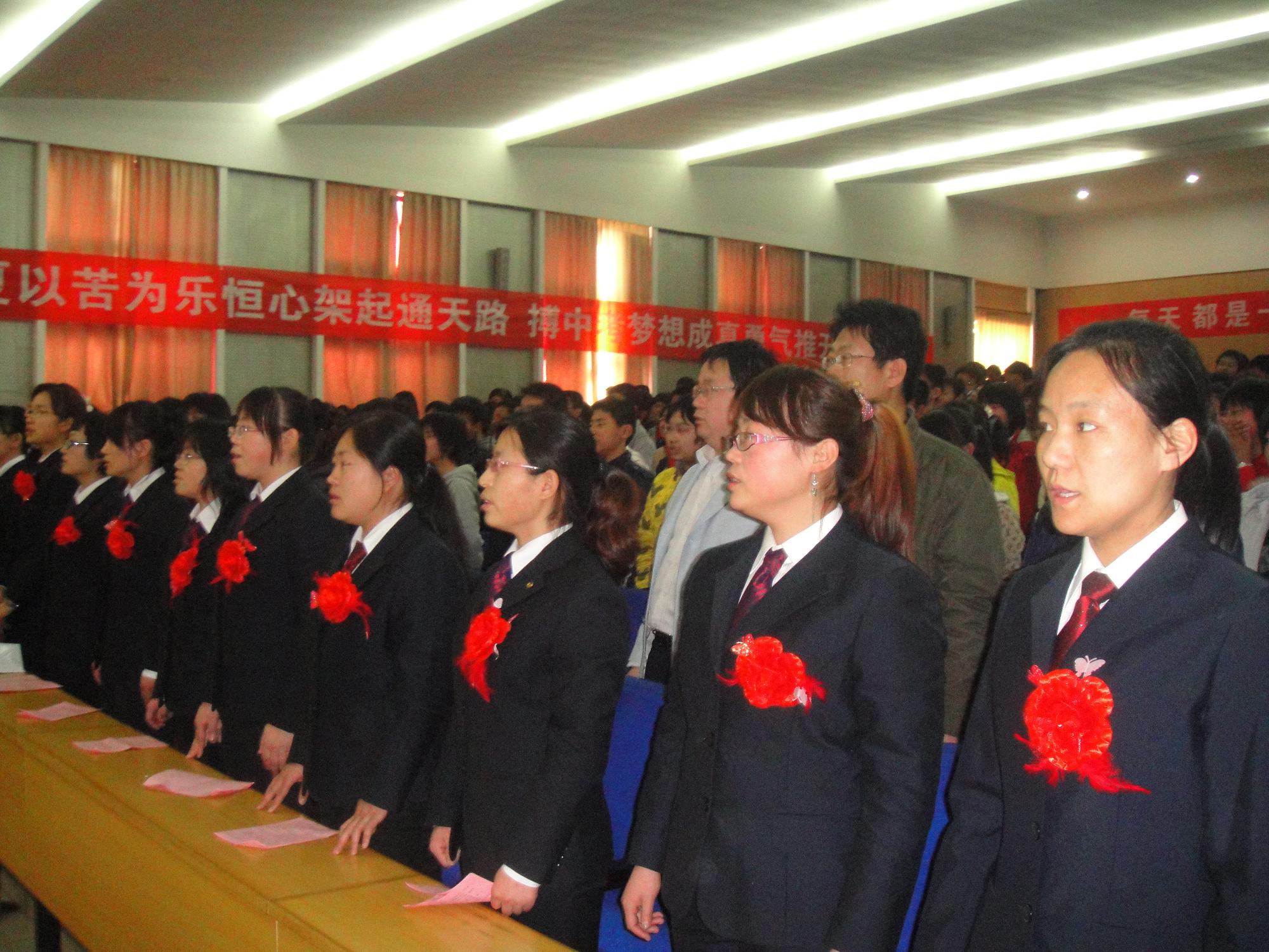 誓师大会上,初三全体教师在《红旗颂》的音乐伴奏下进行的精彩演讲和庄严宣誓,更是激发了同学们的冲天热情,老师们的演讲一次次被同学们热烈的掌声所打断,“就算天再高,只要踮起脚尖,就能更靠近阳光”的演讲词牢记在同学们心中。