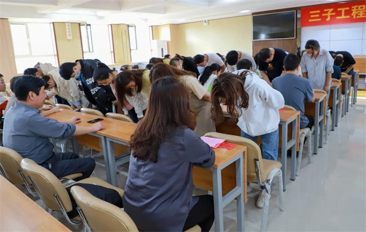 高二年级刘静岩(师)、李瑞情(徒)、高三年级李兰所(师)、吴洁(徒)和高四年级杨福利(师)、范惠惠(徒)代表承诺决心,师傅将言传身教,徒弟定虚心求教,共结师生情,同心共进步。