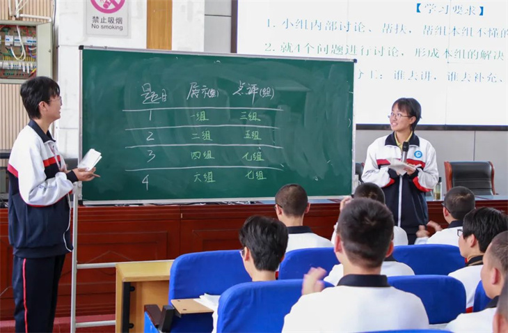 幸兴老师首先为学生们讲授了《将进酒》的示范课,带领学生以“吟诵法”、“歌诀法”鉴赏诗歌、体味意境,并让学生采用小组合作交流的形式讨论解答问题,再由其他小组点评评价,使学生们最大限度地参与了进课堂学习之中。