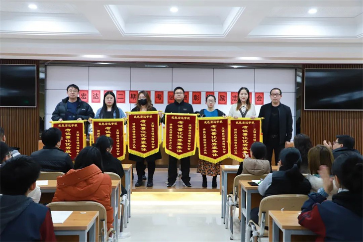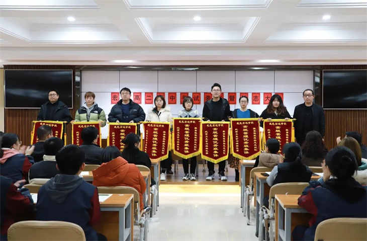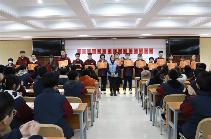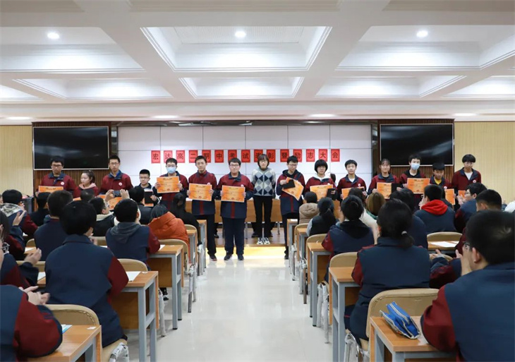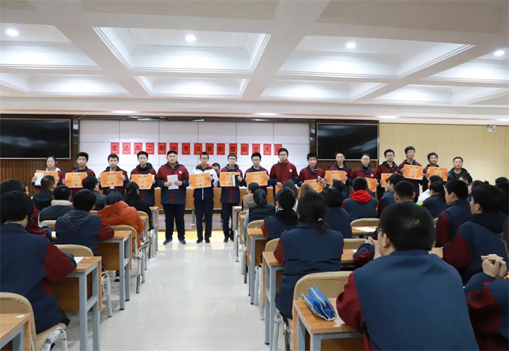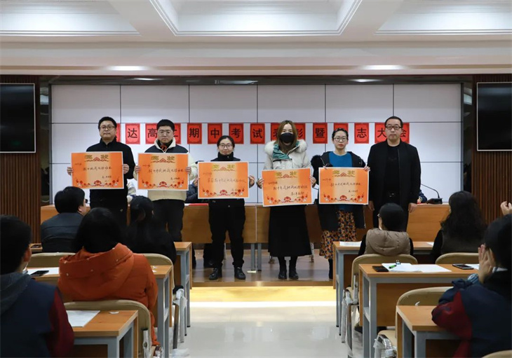 会议上,孟亚飞主任向大家宣读了期中考试进步学生名单,王娇主任宣读了期中考试优秀学生名单及挑战成功班级,卫银周主任宣读了常规管理优秀班级及考试量化优秀班集体, 并由领导为获奖的师生颁发奖状和奖品。