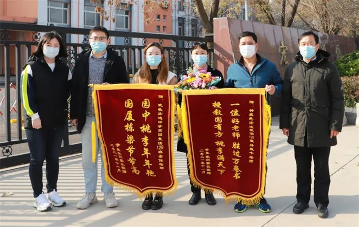 近日,我校高三年级129班学生张则的家长来到学校,为班主任孙双千及129班全体教师送来了两面锦旗,“一位好老师 胜过万卷书 授教固有方 桃李满天下”、“园中桃李年年艳 国厦栋梁节节高”充分展示了家长对我校老师的肯定,我校高三年级主任张延华、129班班主任孙双千在校门口热情接待了前来的家长。