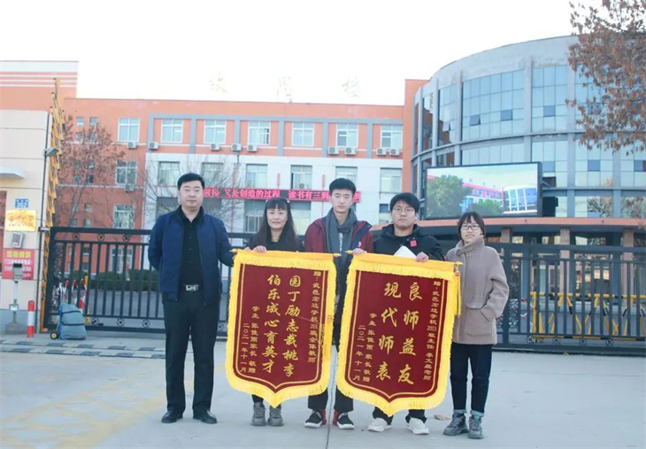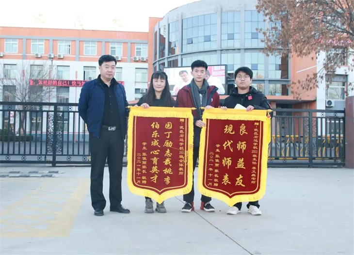 近日,我校高二年级53班张佳雨家长满怀感激之心地将绣有“园丁励志栽桃李 伯乐成心育英才”字样的锦旗献给我校李文磊老师,同时还将绣有“良师益友 现代师表”字样的锦旗送给53班全体教师,以此感谢老师们对孩子无微不至的照顾和关怀。高二级部主任王娇,班主任李文磊代表其他任课老师收下锦旗并与学生家长合影留念。