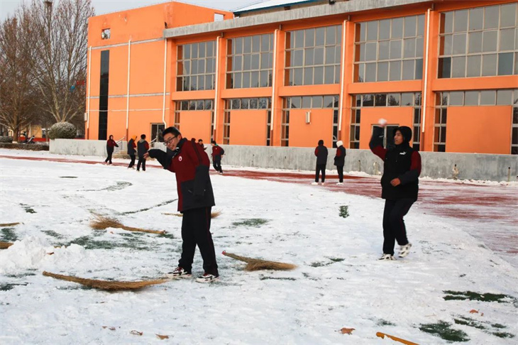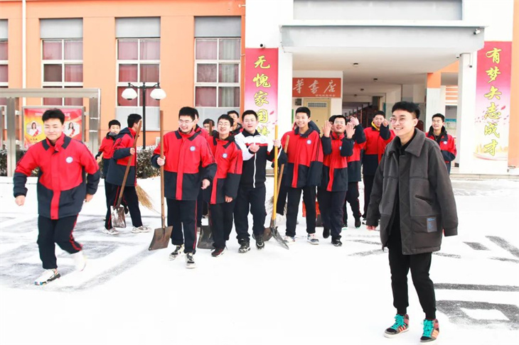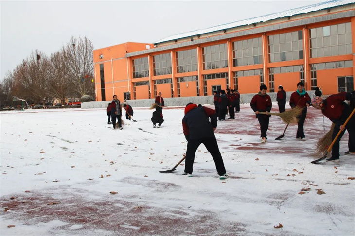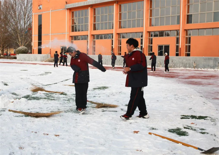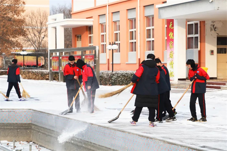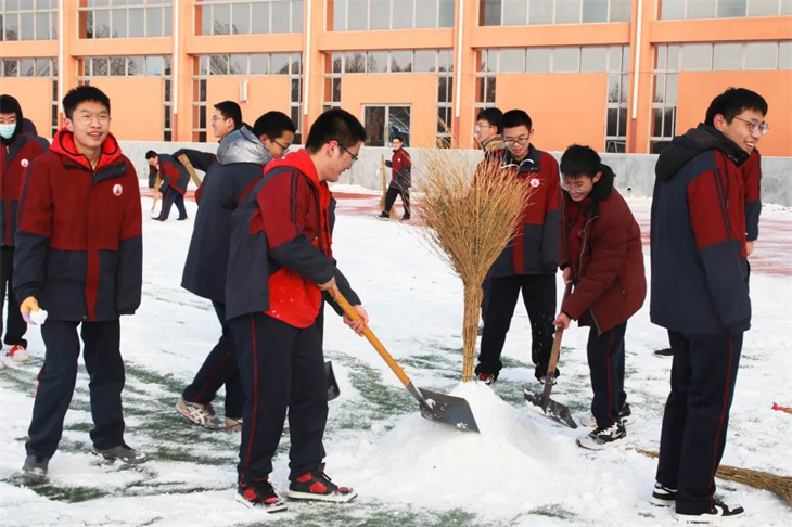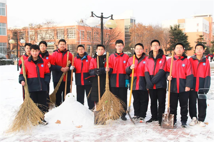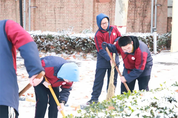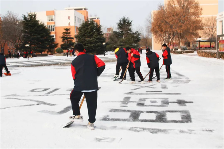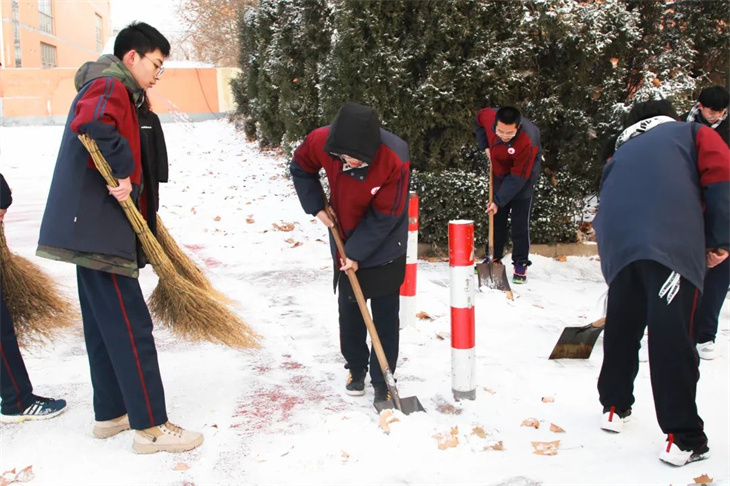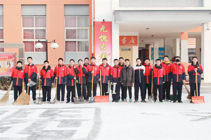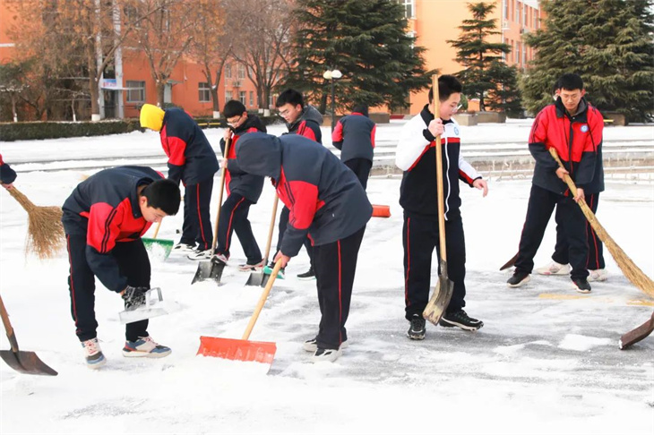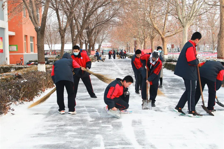 即使在寒冷的天气情况下,冒着凛冽的北风,各班同学们仍是干劲十足,拿起铁楸和扫把,加入这场除雪攻坚战,在大雪中清理出一条条道路。