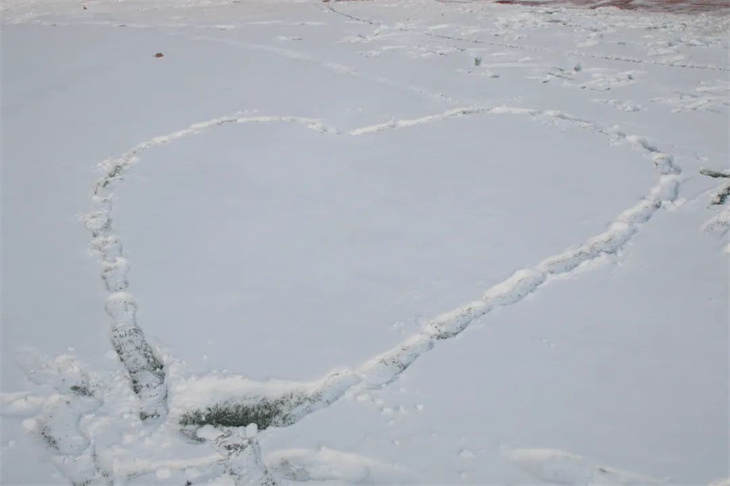 同学们在雪地上用铁锹写下美好的祝福,并一起合影记录下这一欢乐时刻。