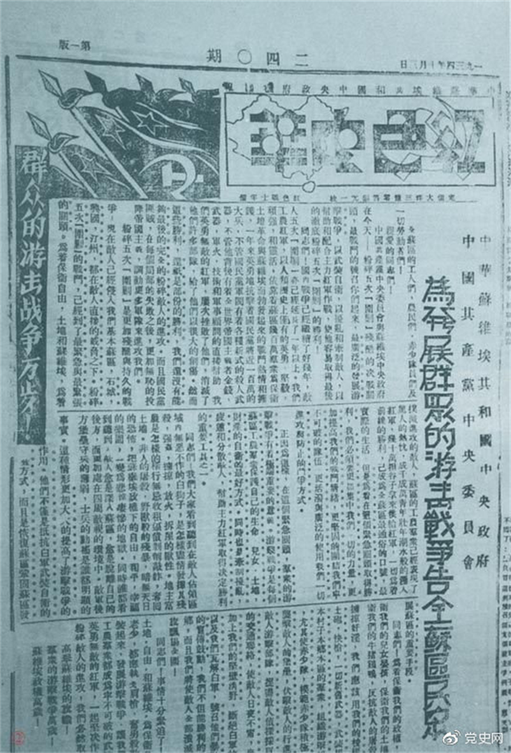 1934年10月,《红色中华》报第240期发表告全苏区民众书,号召发展群众游击战争,保卫苏维埃政权。