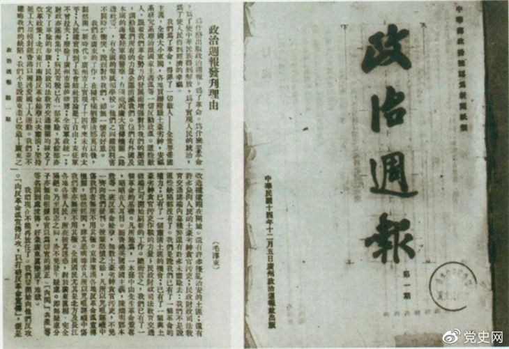 1925年12月5日出版的《政治周报》创刊号和毛泽东撰写的《〈政治周报〉发刊理由》。