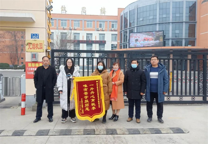 近日,我校高三年级106班学生家长来到学校,为班主任刘利敬老师送来了一面锦旗,“一片丹心育桃李 唯有苦学报师恩”充分展示了家长对刘老师的肯定以及学生定会努力学习的决心,我校高三年级主任张延华、级部主任张伟及106班班主任刘利敬、数学老师刘敬美在校门口热情接待了前来的家长。