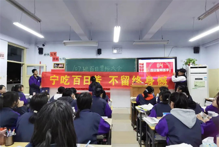 “在最后的一百天,平心静气,冷静面对,设定自己逐步晋级的分数标杆,用不断攀升的分数诠释自己努力的分量,要咬定青山不放松,朝着自己既定的目标不断奋进!”