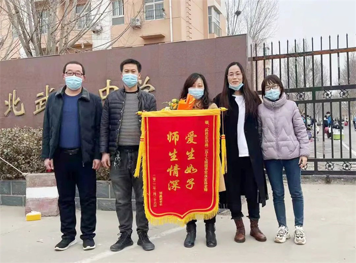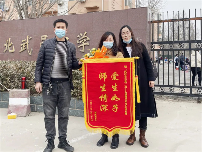 在新学期开学之际,我校高二年级57班刘鑫研的学生家长来到学校,满怀敬意之情向57班班主任魏华军及全体老师送来了一面写有“爱生如子,师生情深”字样的锦旗和一束鲜花,借以感谢学校老师对孩子真诚的关爱和无私的帮助,鲜红的锦旗、真切的话语、由衷的谢意,无不表达着家长对学校及老师的赞誉和高度认可。我校高二年级主任吴少杰,级部主任王娇和班主任魏华军在校门口热情接待了前来的学生家长。