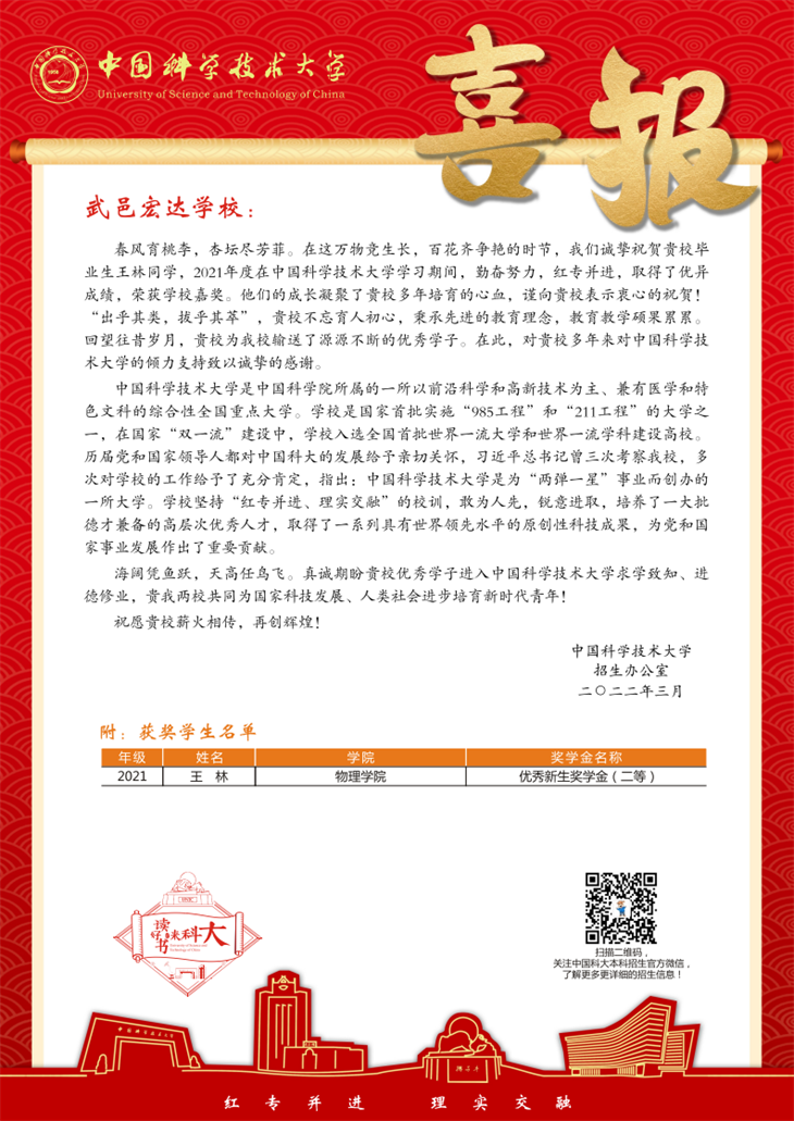 2021年度,我校优秀毕业生王林同学在中国科学技术大学学习期间,勤奋努力,红专并进,取得了优异的成绩,荣获物理学院优秀新生奖学金(二等),中国科学技术大学特向我校发来喜报表示祝贺与感谢,并期待我校更多优秀学子能报考中科大,在中国科学技术大学里求学致知、进德修业,与我校共同为国家科技发展、人类社会进步培育新时代青年!