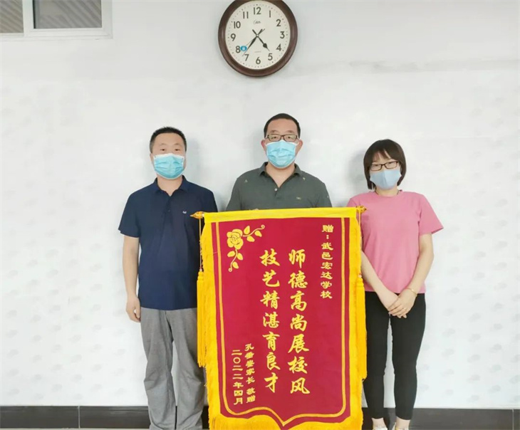 近日,我校高二年级孔垂鋆学生家长通过邮寄的方式向我校及班主任赵凤军老师、蔡国平老师和张晓阳老师赠送了锦旗。四面锦旗上写着“师德高尚展校风 技艺精湛育良才”、“德才兼备育栋材 深情似海系学子”、“精神教学育成才 受益终身感恩师”、“用心做教育 用爱为人师”的字样。这是家长深深的感激之情,代表了家长们对老师们辛勤工作的肯定和认可!