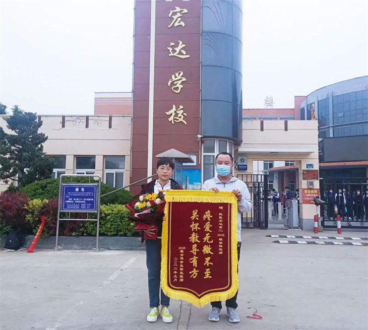 2035班班主任孟祥丽(左一)和家长代表(右一)锦旗合影