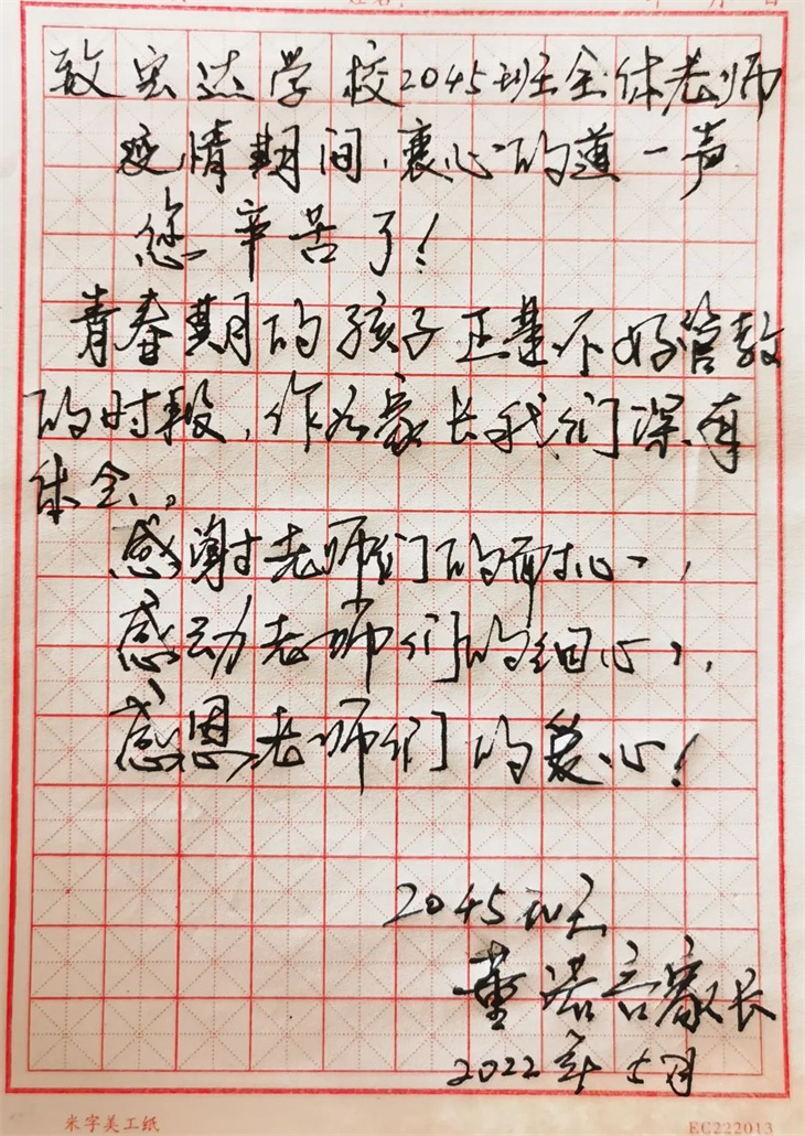 锦旗虽轻,情谊很重,一面面锦旗无处不彰显着学生家长们对我校老师们为人师表的肯定与鼓励、对我校教育工作的认可和支持。2045班董诺言家长更是手写书信,以表达内心对学校老师的诚挚感谢。