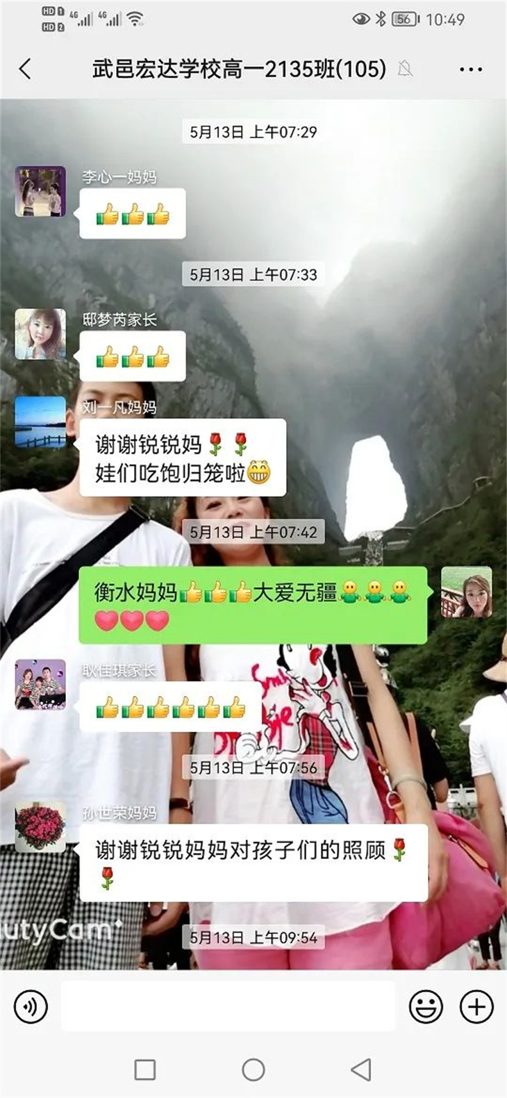 那一夜,我想念着儿子,辗转不安、心痛流泪、思绪到深夜才入睡。第二天到了单位,只要孩子在衡水就读的同事纷纷议论这奇怪的消息。我无心工作直到晚上班主任谢老师在家长群里正式通知了:5月11日--13日放假的消息。家长们怨声一片,我心急如焚。就在这同一时间段里,谢老师又传达了一条欣喜的信息“外地的孩子愿意留校的就留校,愿意和当地同学回家的就一起回”。闪电般的信息瞬间传开,班集群里的衡水妈妈踊跃报名都要当孩子们的妈妈!班级群的家长们热闹非凡,都是感激不尽、大爱无疆的暖心话...哇塞,这无名群里也没有人再抱怨不满了,都在给衡水老师和衡水妈妈们献花、比心、点赞,还有激动的发起了红包雨...哈哈,雨过天晴的这一刻阳光普照大地,温暖在爱的怀抱里,这一夜,我感动的落泪,甜蜜的入睡......