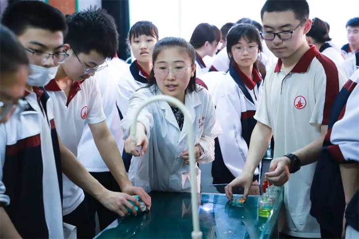王焕领老师带领学生一起探究实验,她耐心地一一解答学生困惑的问题,并亲自动手指导学生完成实验,学生们在一旁认真看着王老师操作,认真学习体会实验的重点和难点。