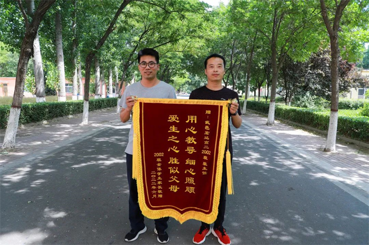 近日,我校高二年级2002班学生家长分别为班主任宁长亮老师和全体教师送上题有“用心教导 细心照顾 爱生之心 胜似父母”、“良师益友 现代师表”、“方法独特效果好 耐心施教品德高”的三面锦旗,以此感谢班主任宁老师和任课老师们对学生无微不至的关心照顾和精心培育。