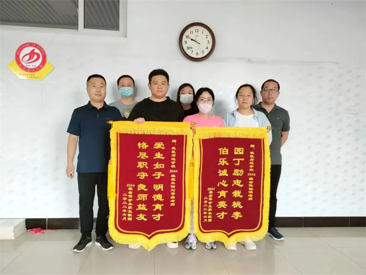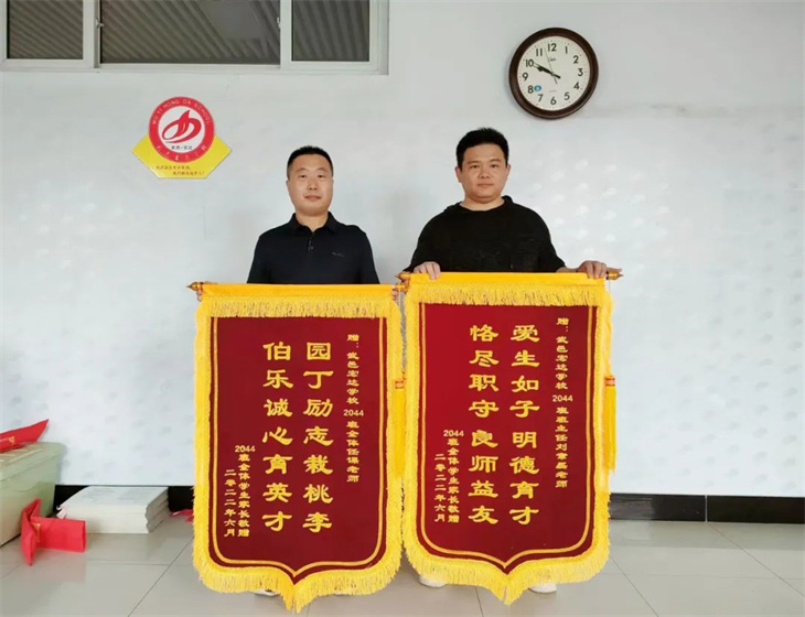 真爱如雨,润物无声,育人无痕。近日,我校高二年级2044班全体家长送来了两面绣有“园丁励志栽桃李 伯乐诚心育英才”、“爱生如子 明德育才 恪尽职守 良师益友”的锦旗,以此表达对班主任刘章磊及2044班全体教师用心关爱学生和无私奉献的感恩之情。