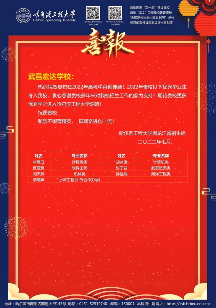 喜报 | 哈尔滨工程大学向我校发来喜报