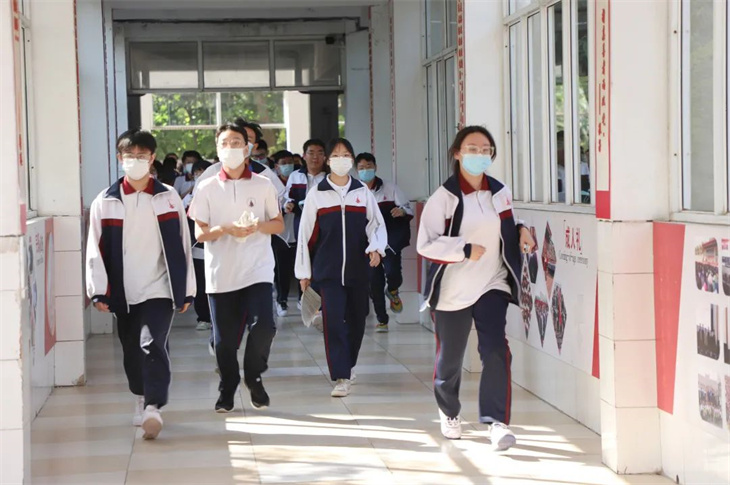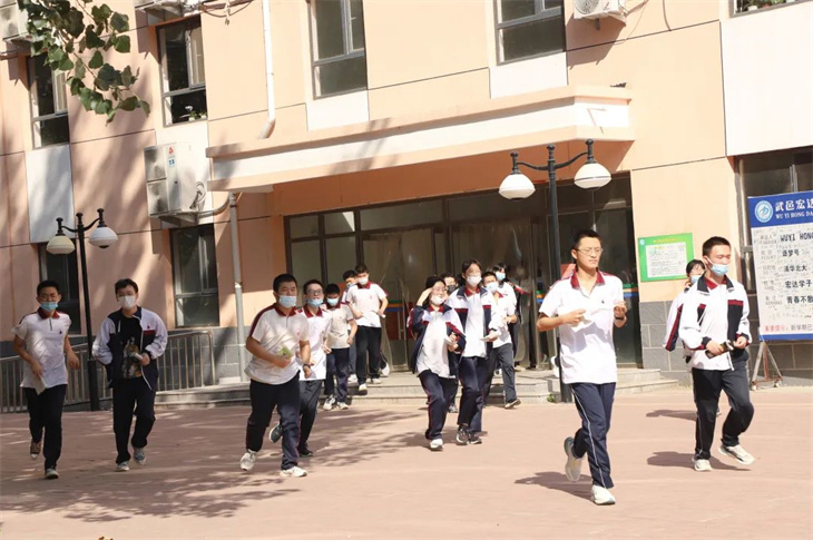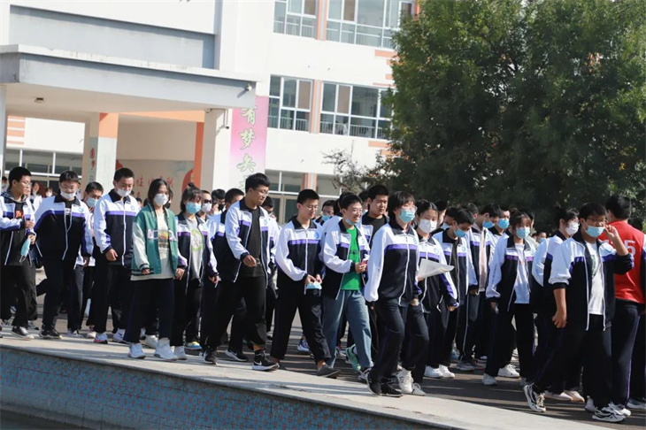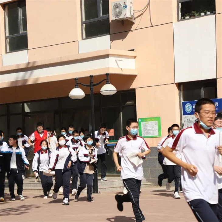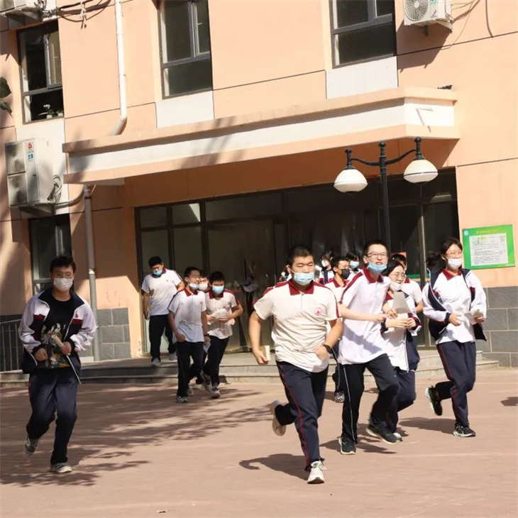 预警过后警报声再次响起,学生冲出教室,在班主任和各楼层值班教师的引导下,按照疏散路线,迅速从就近的楼梯口有条不紊地撤离,进入空旷的安全地带。