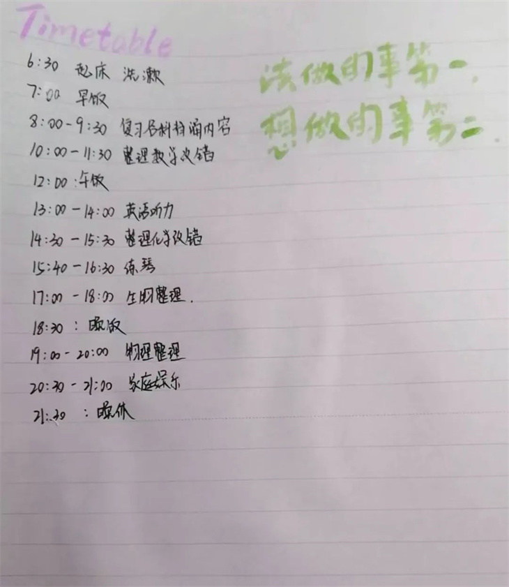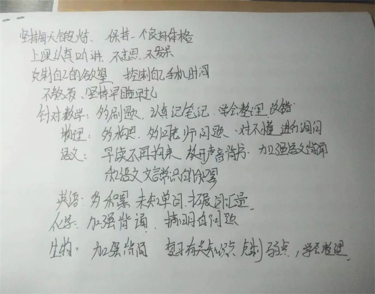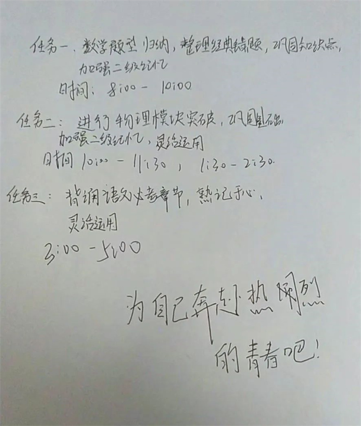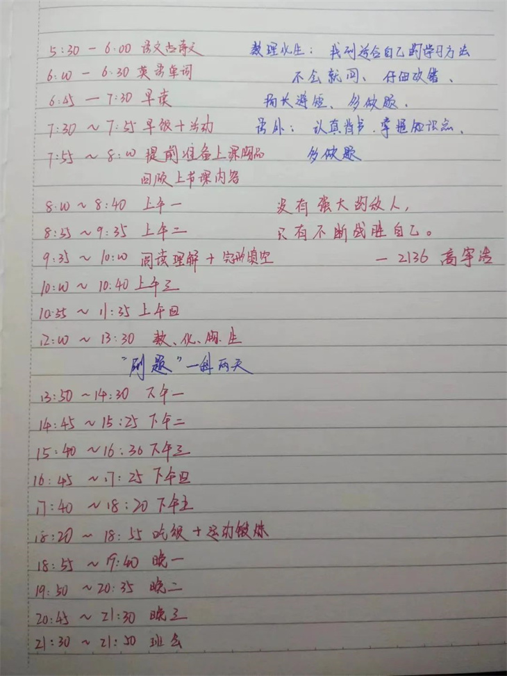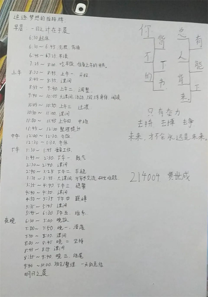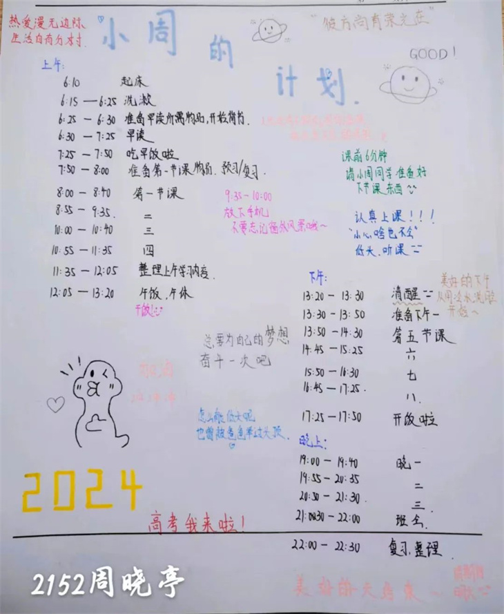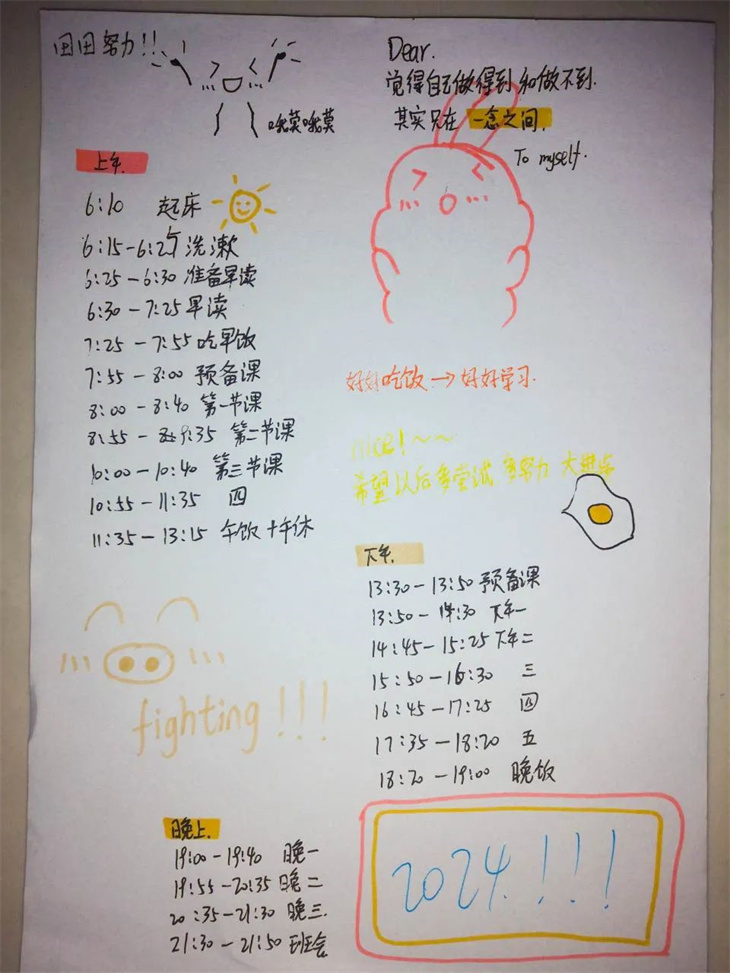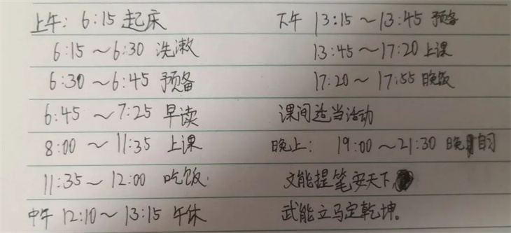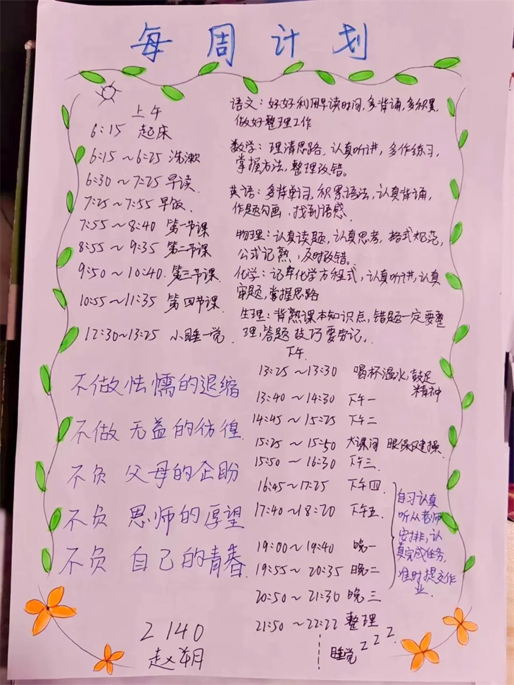 同学们专注于每天的计划,制作专属自己的行程表。将自己的起床、吃饭、上课、作业、放松…..统统规划进来。不做怯懦的退缩,不做无益的彷徨,不负父母的期盼,不负恩师的厚望,不负自己的青春,珍惜每一天,过好每分每秒。