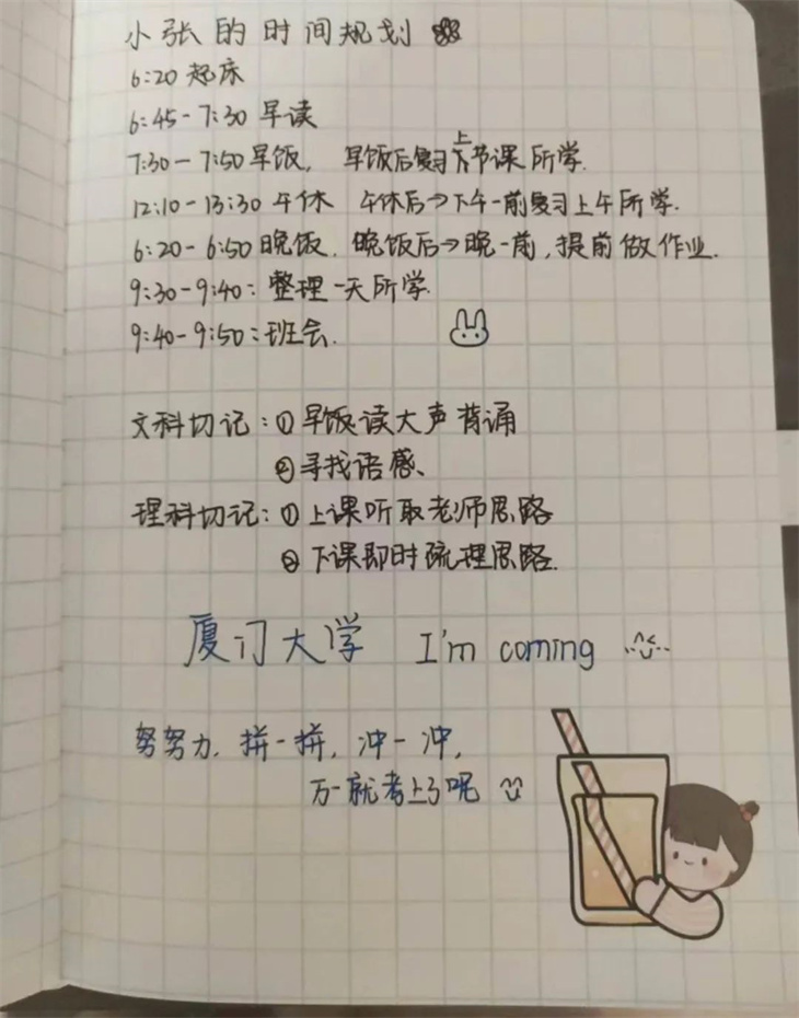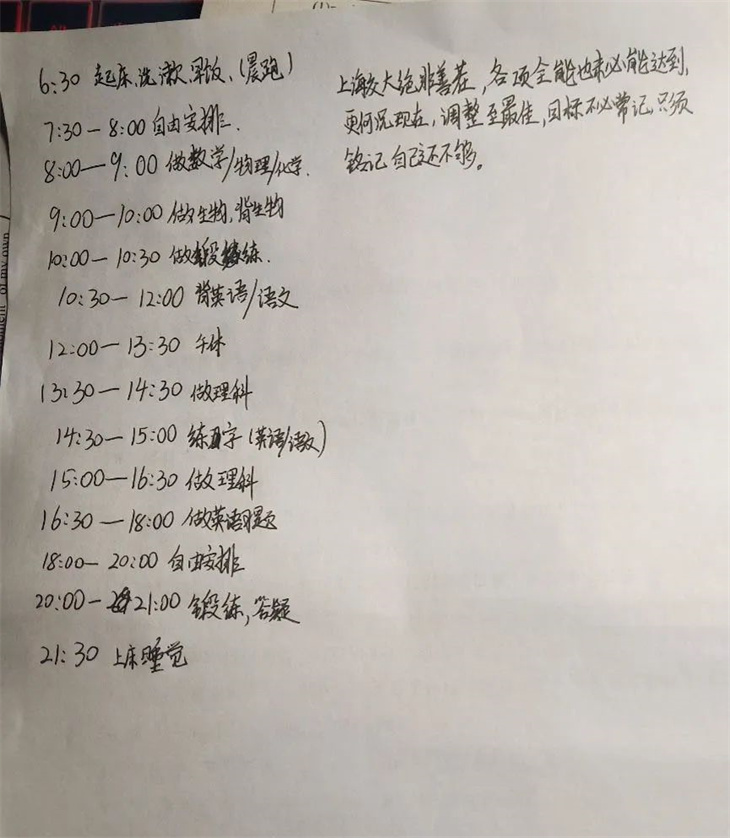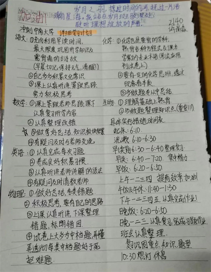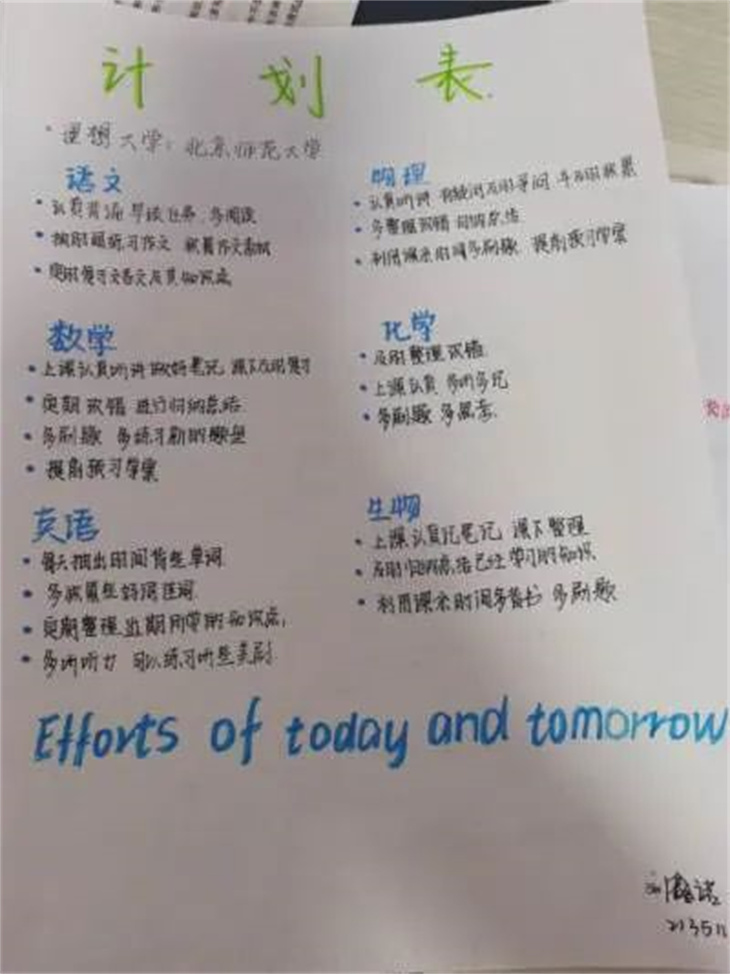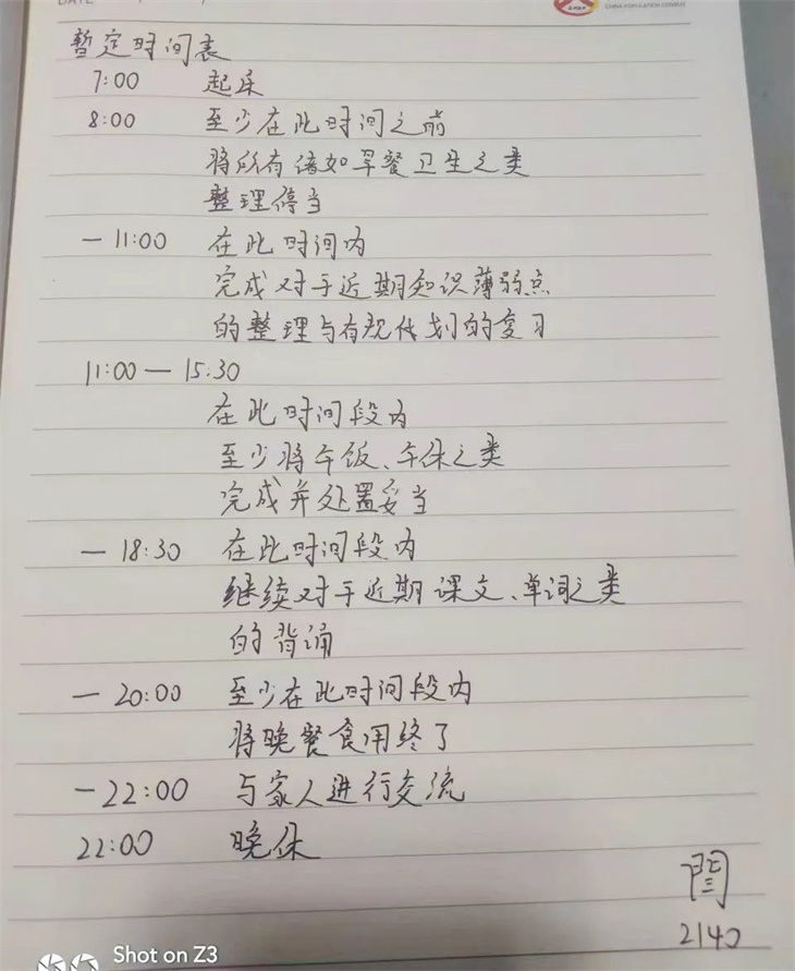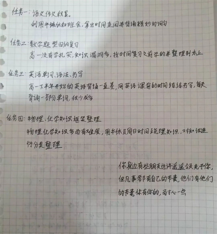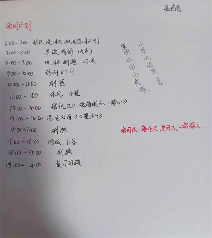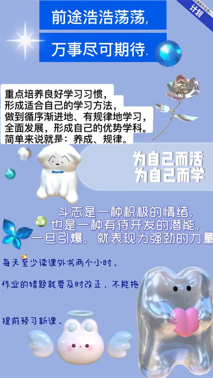 同学们专注于每天的计划,制作专属自己的行程表。将自己的起床、吃饭、上课、作业、放松…..统统规划进来。不做怯懦的退缩,不做无益的彷徨,不负父母的期盼,不负恩师的厚望,不负自己的青春,珍惜每一天,过好每分每秒。