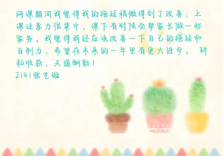 成功的花儿,人们只惊羡她现时的明艳,然而当初她的芽儿,浸透了奋斗的泪泉。努力和坚持终究会惊艳了时光,只要你一直在前行,前方一定会有无比美丽的风景在等着你。勤勉不辍,未来可期!加油,同学们!