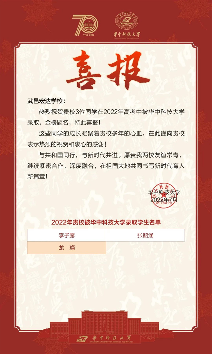 2022年,武邑宏达学校教学质量和育人成绩再创新辉煌!本一上线人数和名校录取人数均取得历史突破,领先地位进一步巩固,让更多学子圆梦宏达学校。