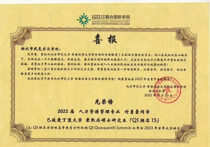 近日,北京师范大学-香港浸会大学联合国际学院向我校发来喜报,祝贺我校付勇豪同学被爱丁堡大学录取为硕士研究生,希望能与贵校继续携手共进,为学生更好发展共同努力,为国家教育事业发展共同奋斗!