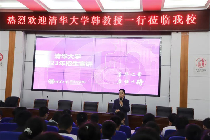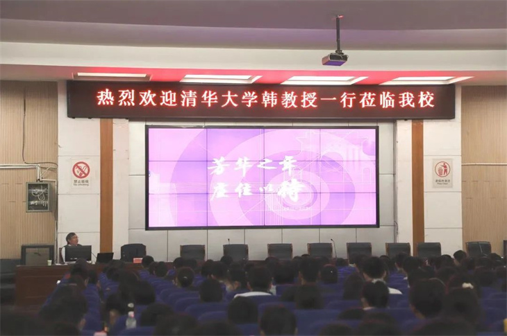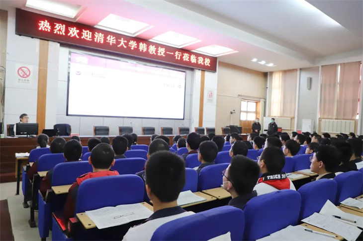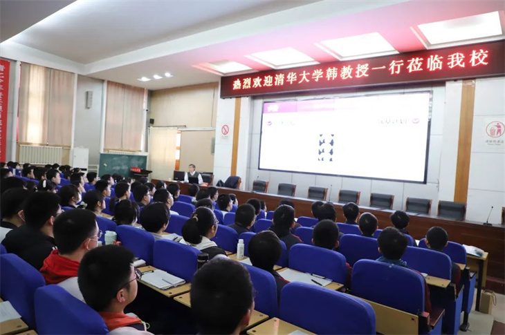在会议中,韩教授以“芳华之年,虚位以待”为题向学生们介绍了清华大学的学校概况、专业设置、学科优势、招生政策等相关情况,并代表学校欢迎同学们报考清华大学,鼓励我校学生在今后的学习中勤奋努力,拼搏进取,在高考中取得理想的成绩。