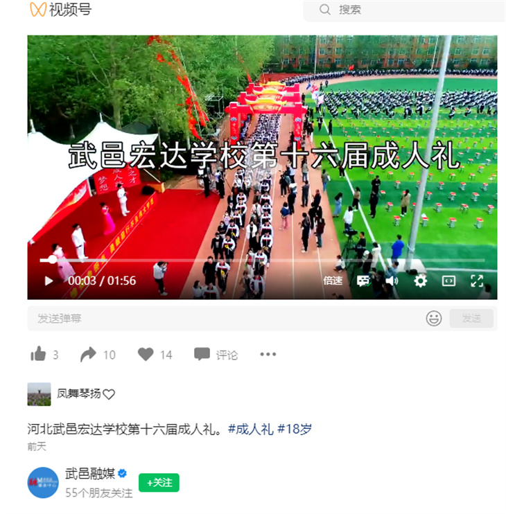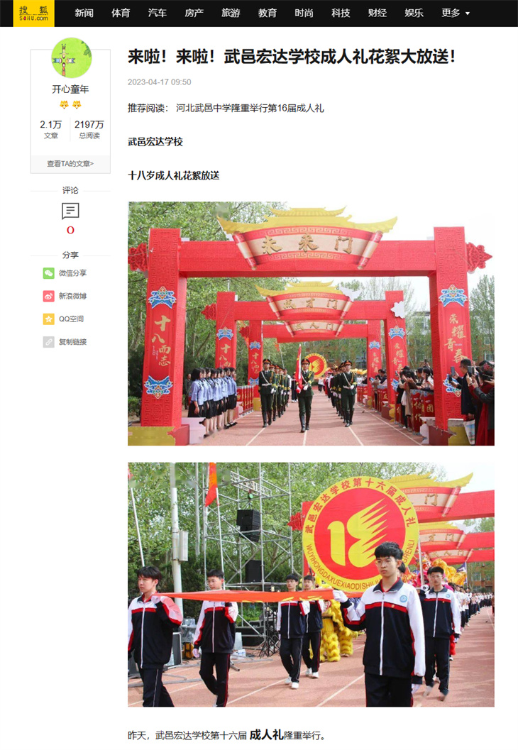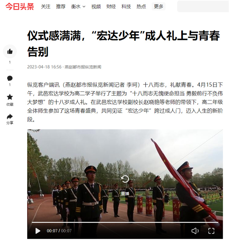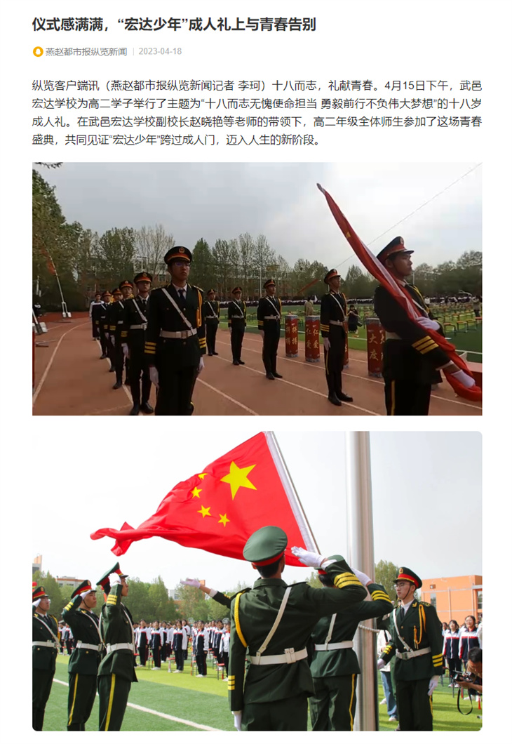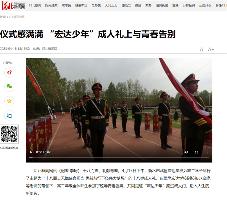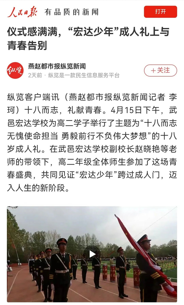 十八而志,礼献青春,大任始承,强国有我。4月15日,武邑宏达学校为高二学子举行了主题为“十八而志无愧使命担当 勇毅前行不负伟大梦想”的十八岁成人礼,校领导、学生家长、学校师生共同庆贺少年们今日成人,迈入人生的新阶段。这一活动,被人民日报、河北新闻网、河北法制报、燕赵都市报、今日头条、搜狐新闻、新浪看点、武邑融媒等多家媒体报道。