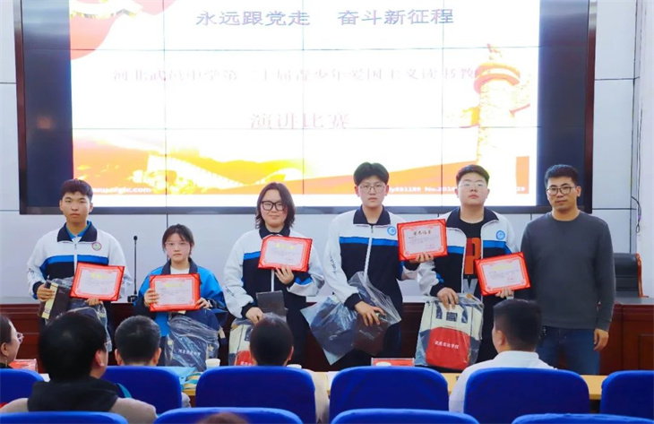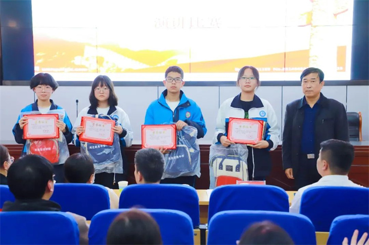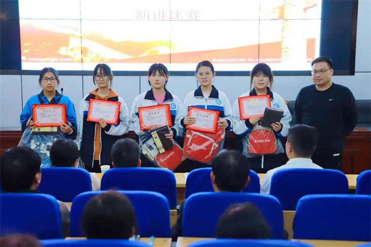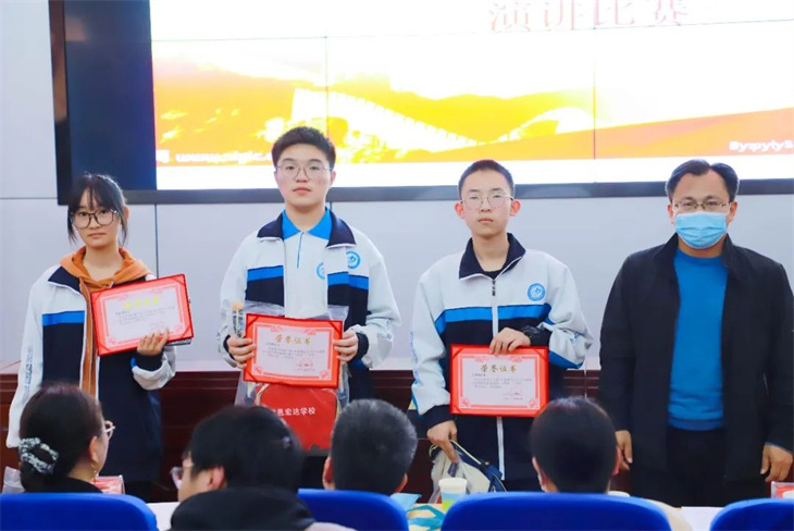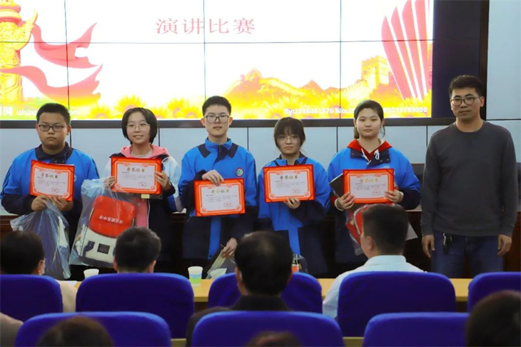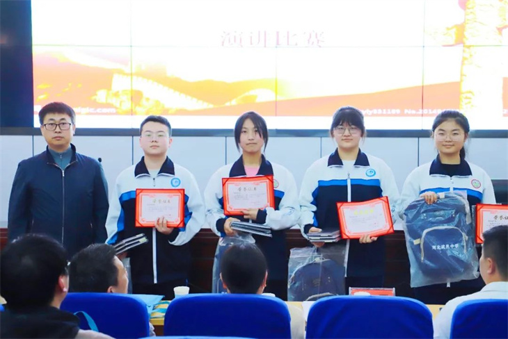 政教处主任张双柱,高一年级主任马利辉、田旺,高一年级级部主任万冬雪分别为获得演讲比赛优秀指导教师、一等奖、二等奖、三等奖的同学颁发荣誉证书和奖品,最后政教处主任张双柱为高一年级主任张延华、马利辉、田旺,高一年级级部主任万冬雪颁发优秀组织奖。