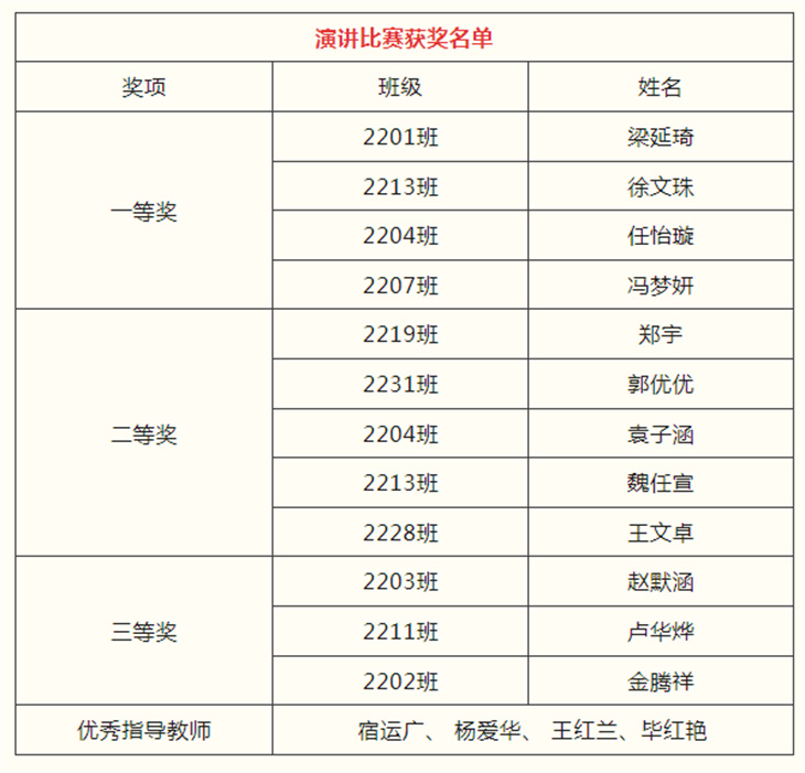 一场场生动而又富有激情的演讲给评委和学生们留下了深刻的印象,在场的评委老师们为这些参赛的选手竖起了大拇指,热烈的掌声是对他们最好的赞美。比赛结束后,各位评委老师从演讲内容、语言表达、形象风度、综合印象等各方面对参赛选手的演讲打分。