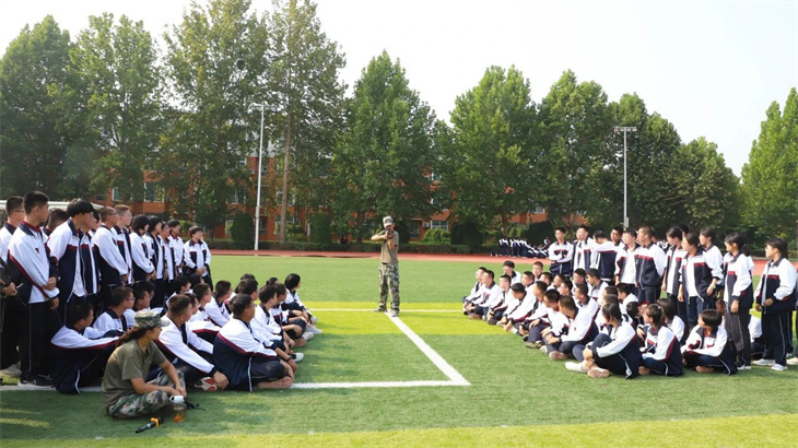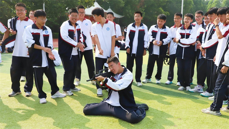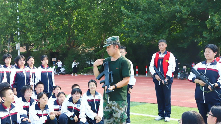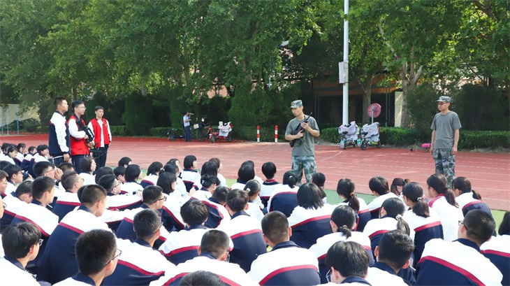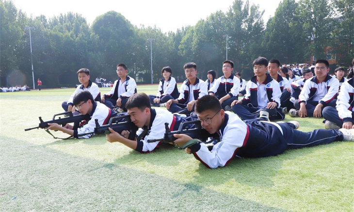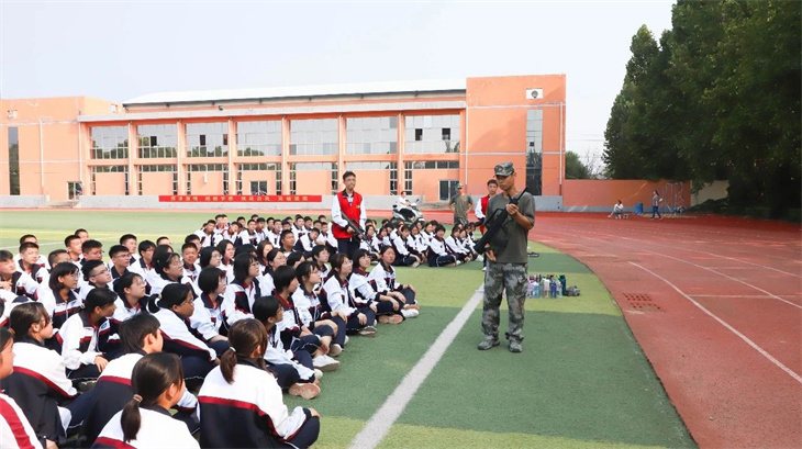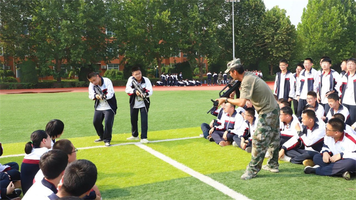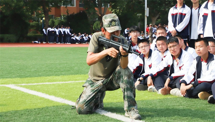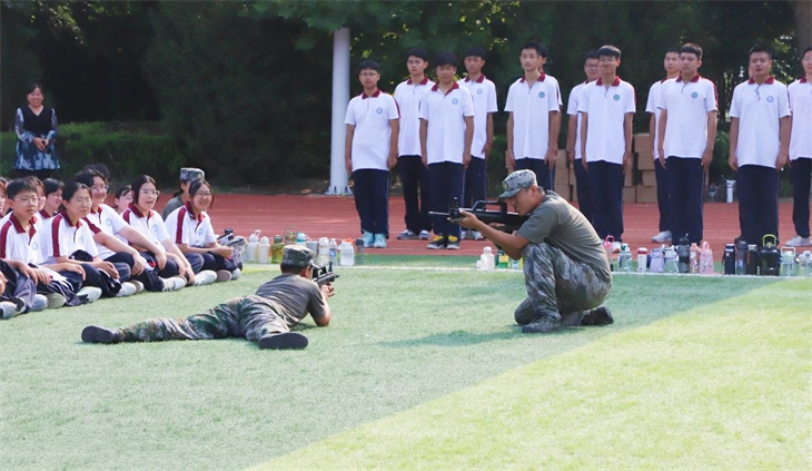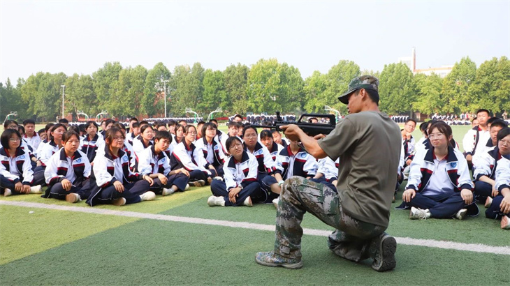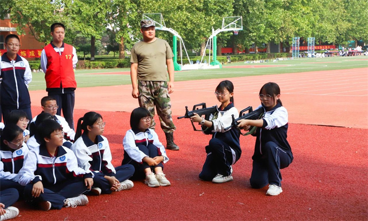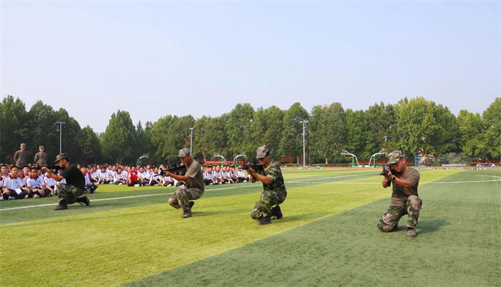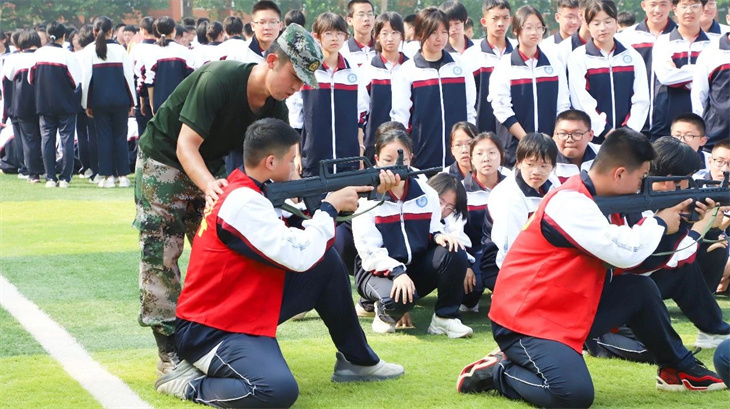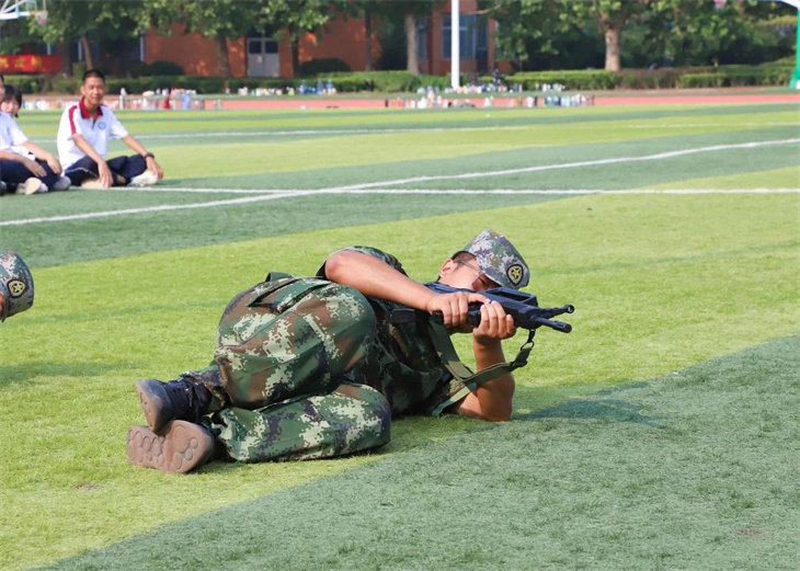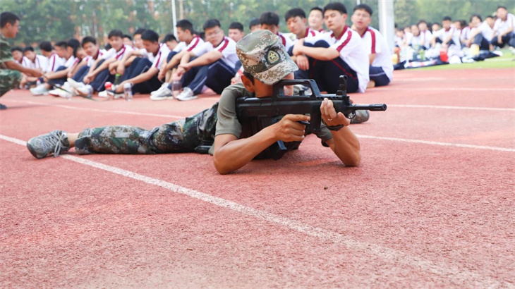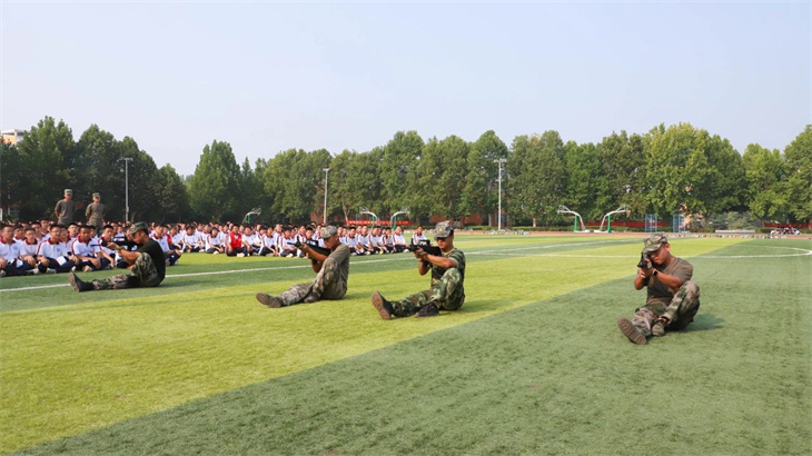 教官们在简单地介绍了枪支的性能后,集体给所有的学生演示了匍匐行动、射击、瞄准等战术动作。教官们娴熟的动作,一气呵成的军事行动,赢得学子们的热烈掌声!