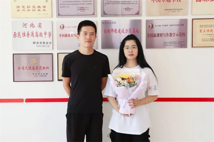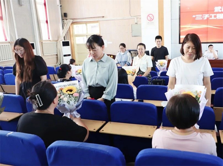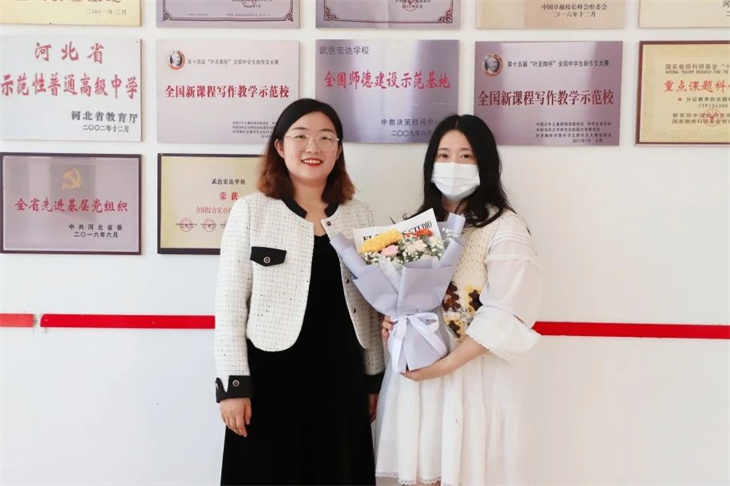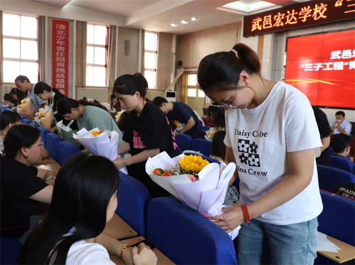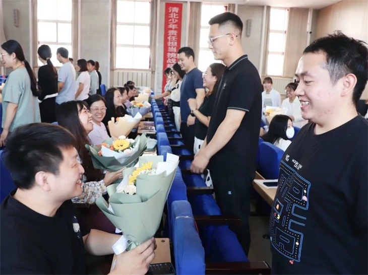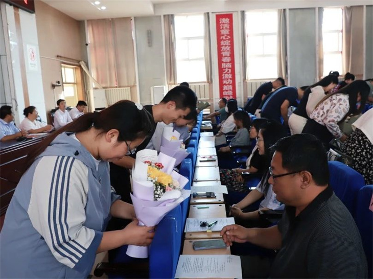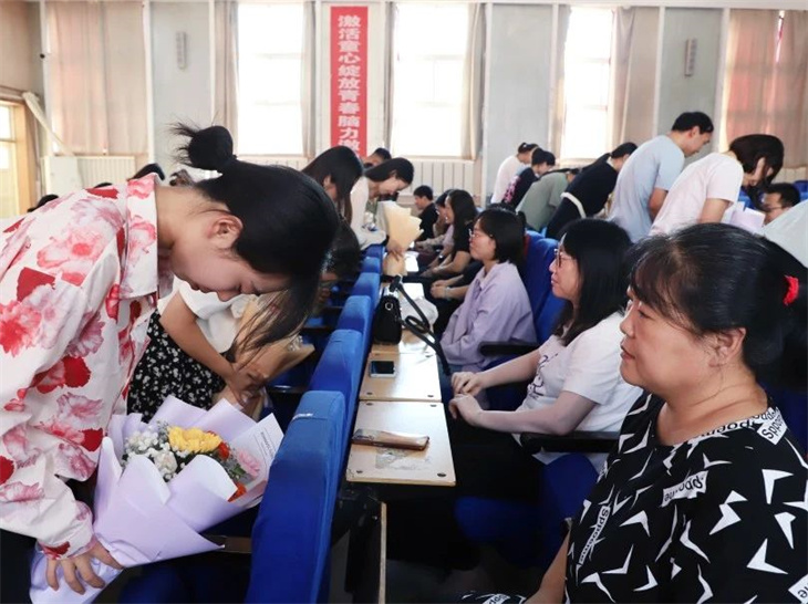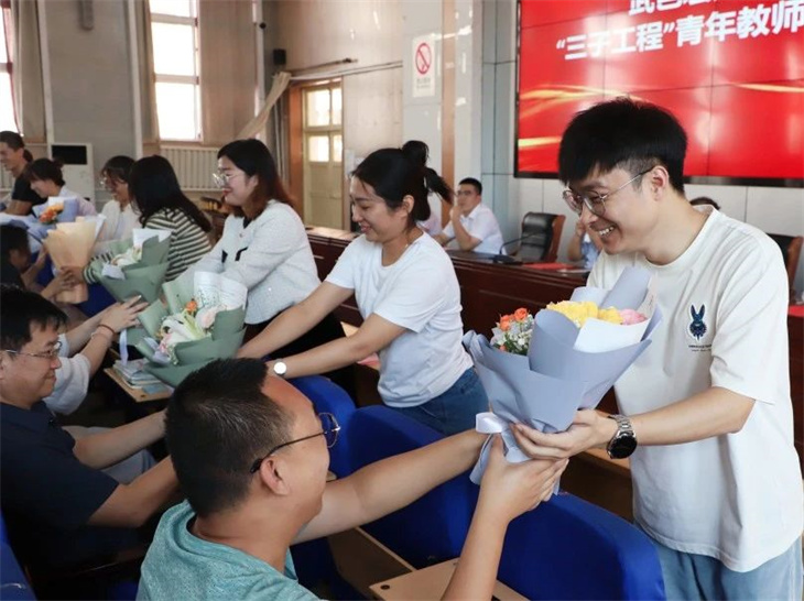 随后高一级部主任郭万发宣布行拜师礼后,青年教师与各自的指导教师签订拜师协议,并向自己今后的师傅深深鞠躬,为师傅献花,与师傅握手,希望今后师傅在教学上严格要求自己,倾囊相授。浓浓的仪式感孕育着教师匠心的传承。