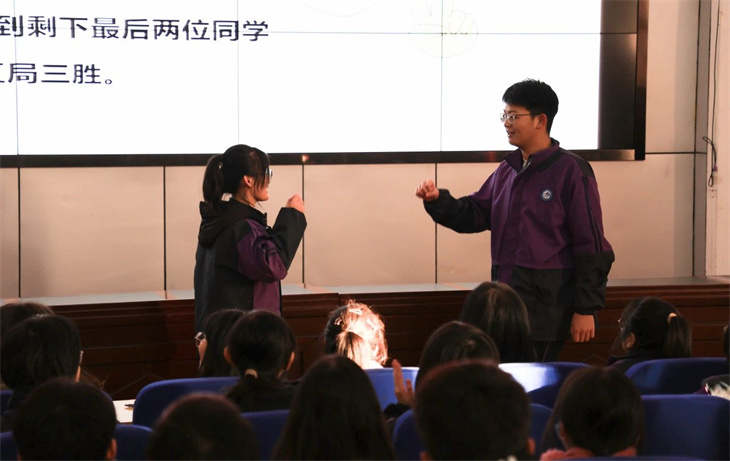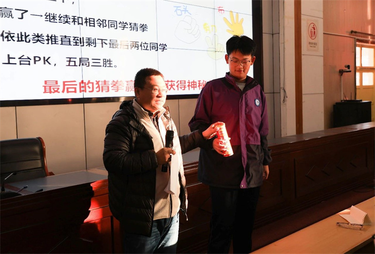 班会伊始,老师以“猜拳”游戏切入主题,让学生们站起来和相邻的同学猜拳,输了的学生坐下,赢了的学生继续猜,以此类推,最后剩下两名同学上台PK,角逐冠军。