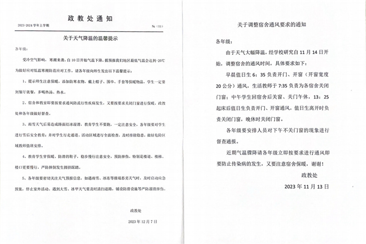 室外寒风凛冽,室内温暖如春。为使学生回到宿舍也是热热乎乎,学校各宿舍暖气全天供暖,水房热水24小时供应。同时及时发布降温温馨提示,调整宿舍通风时间。宿舍生活教师上、下午时刻也会及时巡查,为学生宿舍关门、关窗,确保宿舍温暖如春。