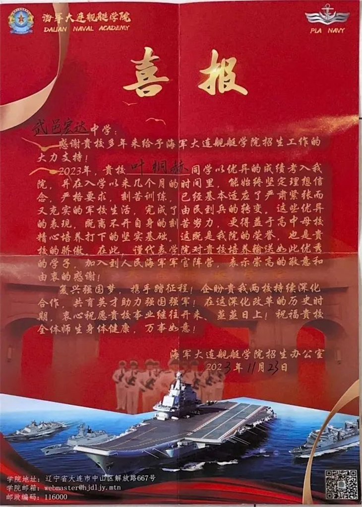 海军大连舰艇学院向我校发来喜报,祝贺我校优秀毕业生叶桐赫同学以优异的成绩考入并始终坚定理想信念,严格要求,刻苦训练,已经基本适应了严肃紧张而又充实的军校生活,完成了由民到兵的转变。