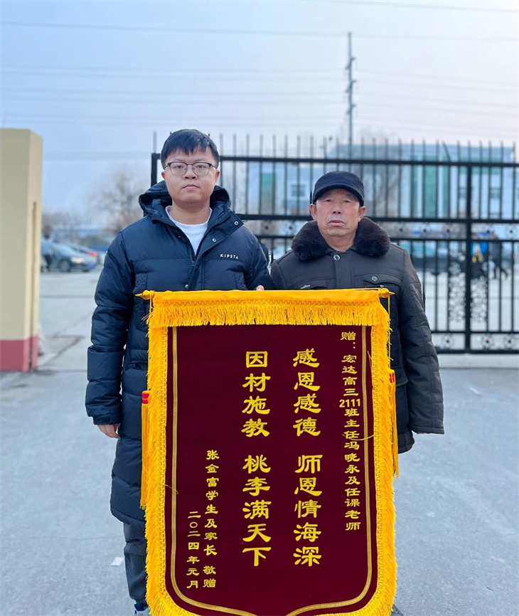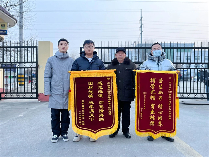 近日,我校2111班班主任冯晓永及全体任课老师收获了一份沉甸甸的礼物——锦旗。张金富学生家长为感谢学校及班主任、老师对孩子无微不至的关心与照顾,特意将两面写有“感恩感德师恩情海深 因材施教桃李满天下”、“爱生如子精心培养 博学艺精育出栋梁”的锦旗送到了班主任冯晓永老师手中,以表达感激之情。
