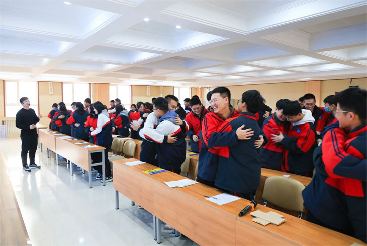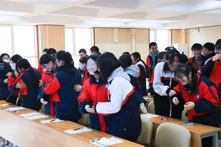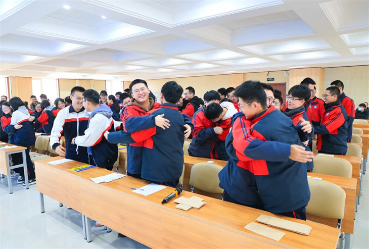 随后,史老师告诉学生要怀着感恩的心前行。通过观看来自爸妈亲友团的鼓励,学生们深刻体会到了父母的支持和付出;通过观看老师的暖心寄语,学生感受到了老师的辛勤教导和鼓励;通过一个饱含温暖的拥抱,学生更加珍惜同窗的陪伴和帮助。感恩之心让学生们更加珍惜眼前的一切,更加坚定地向前迈进。