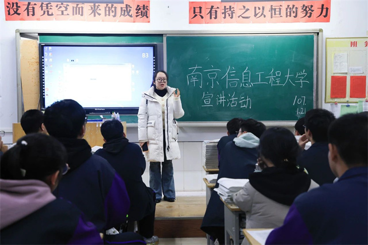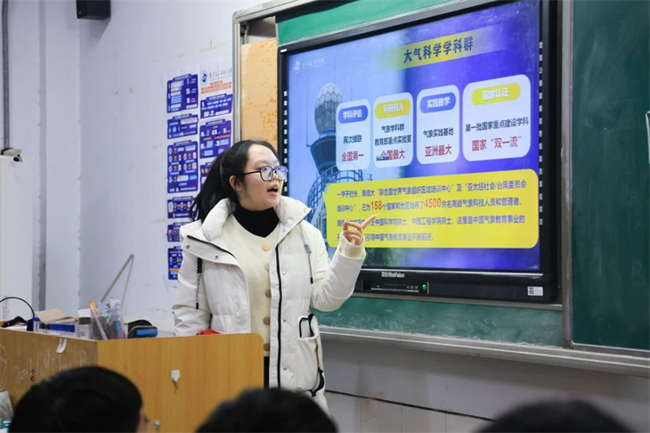 宣讲会上,叶璐嘉同学以PPT和视频的形式向学弟学妹们介绍了自己所在大学——南京信息工程大学的特色、重点学科、招生政策及就业形势等。