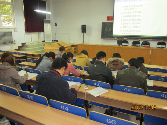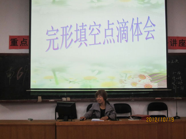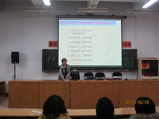 11月2号上午8:30宋茜老师在我校报告厅举行了一堂题为《高考完型点滴体会》的讲座。宋茜老师执教20年,教学经验丰富,尤其总结了很多实用的技巧。本堂讲座上,宋老师根据2012全国各地高考完型试题,用实际例子验证自己在教学中总结的一整套完型方法。理论结合实际,语言质朴平实,给在场的各位老师留下了深刻的印象。