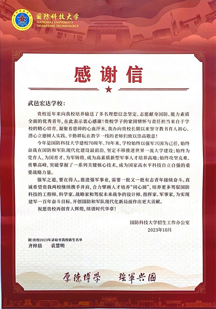 近日,我校收到国防科技大学发来的感谢信,感谢我校为其输送了多名理想信念坚定、志愿献身国防、能力素质全面的优秀青年。在此,祝贺我校优秀毕业生齐梓晨、袁慧明成功考取国防科技大学。